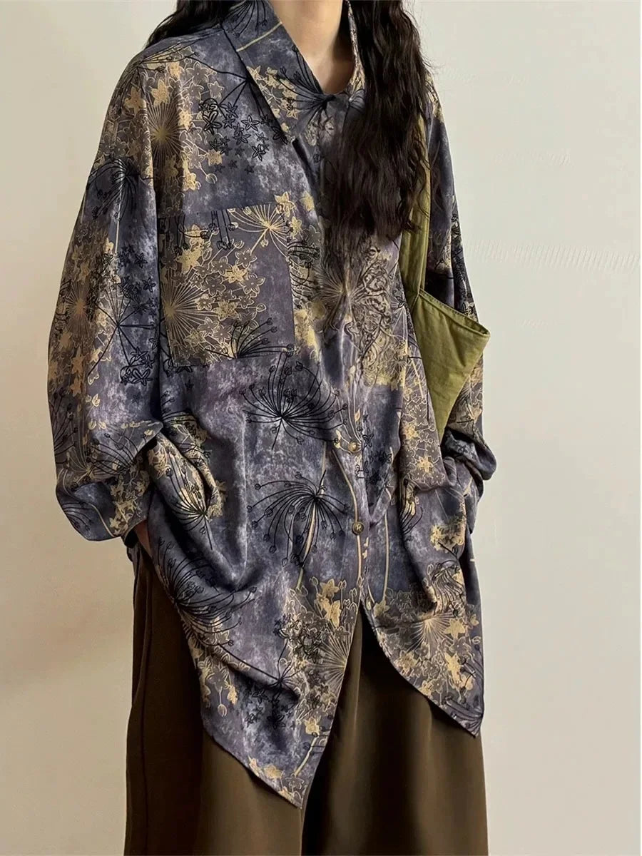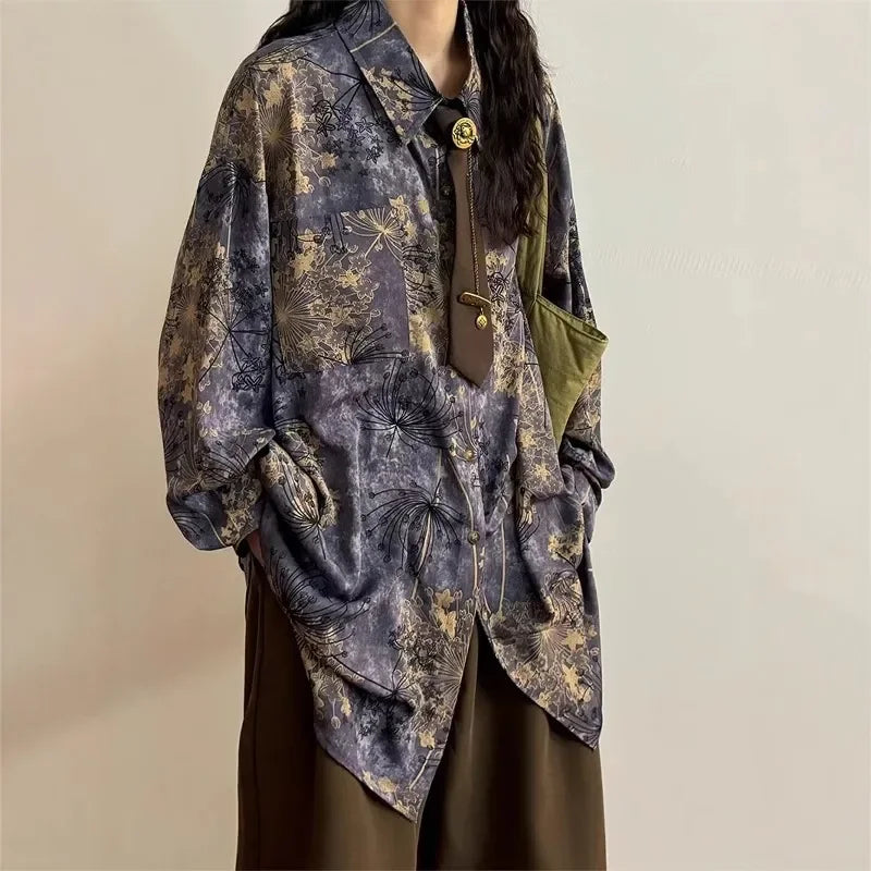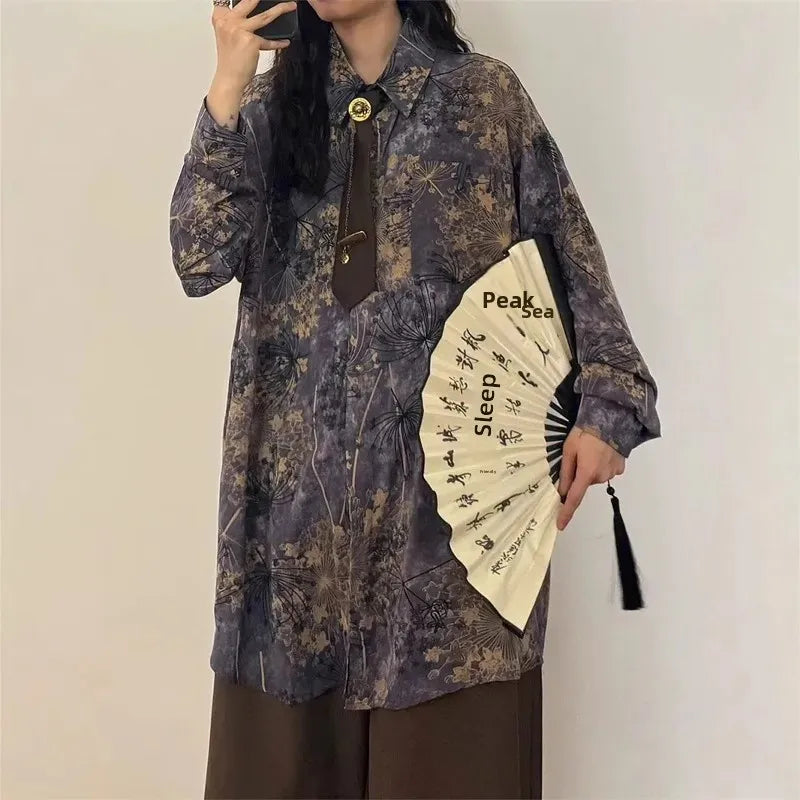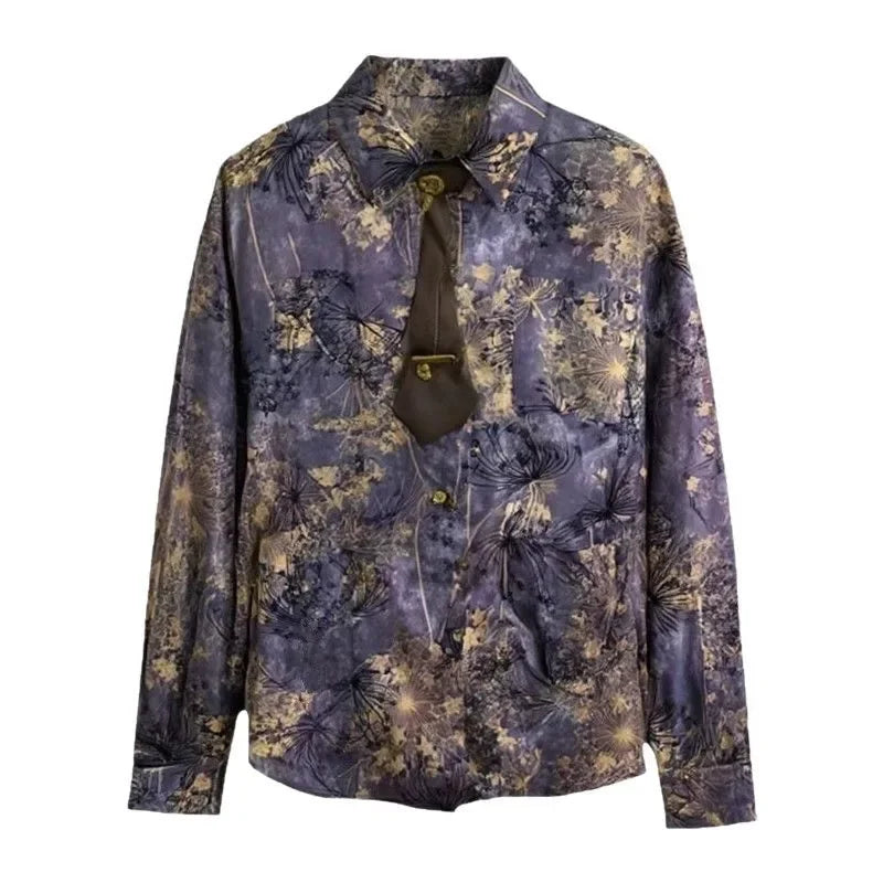 HEARUJOY - Loose Long Sleeve Shirt Men Women Casual Streetwear American Retro Purple Print Inner Wear Fashionable Male Female Top