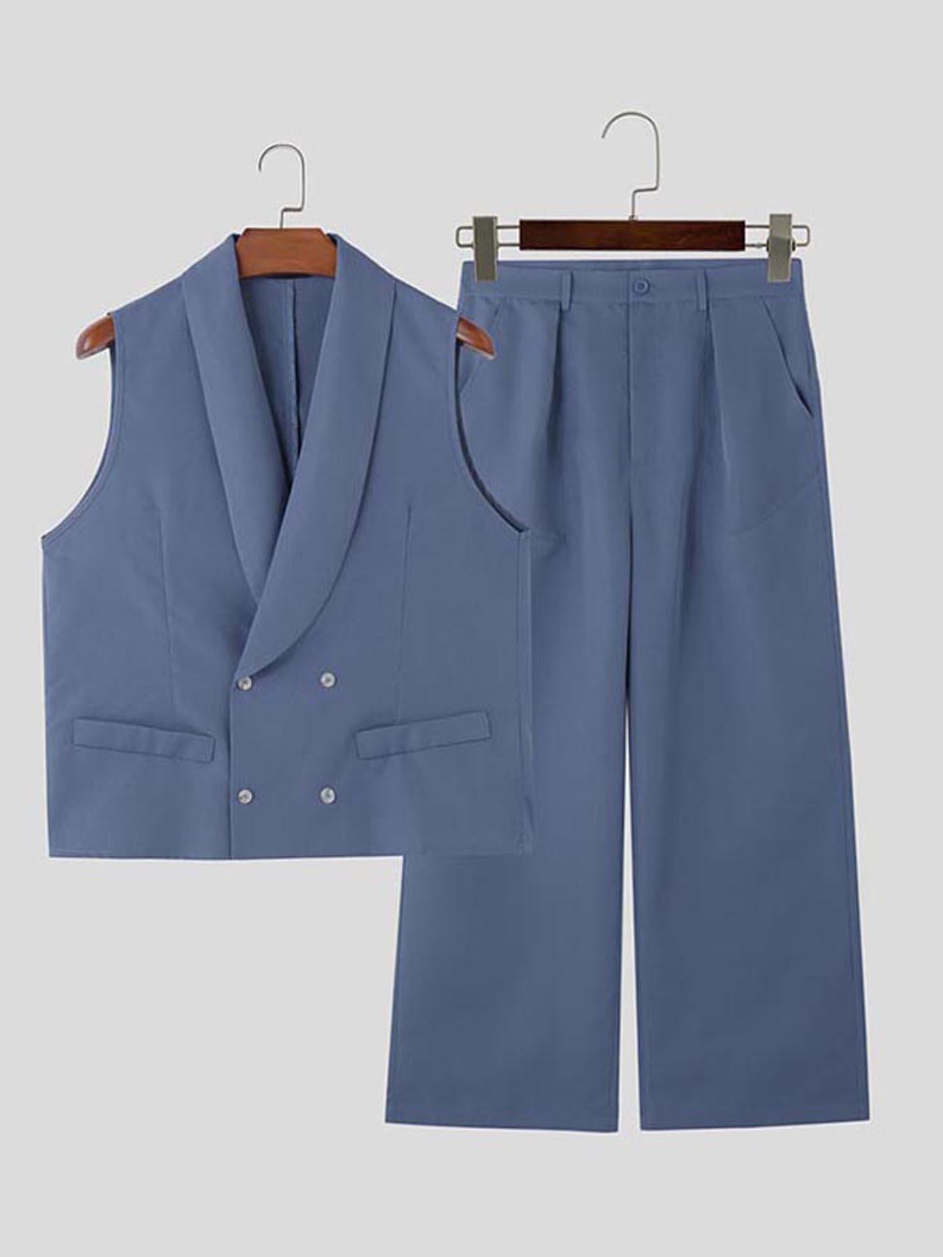 HEARUJOY - Men Casual Solid Color Shawl Collar Double Breasted Vest with Buttoned Waist Front Zipper Straight Leg Pants Baggy Thin Formal Work Pants Blazer Suit - Polyester, Non-Stretch, Summer, Regular Fit, Woven, 130g/m²