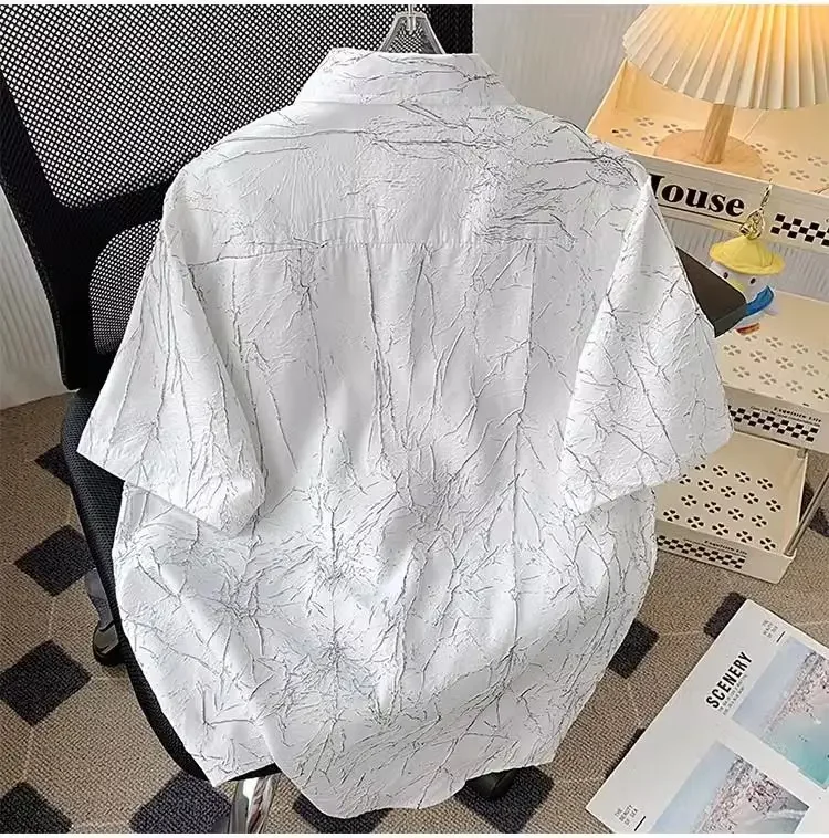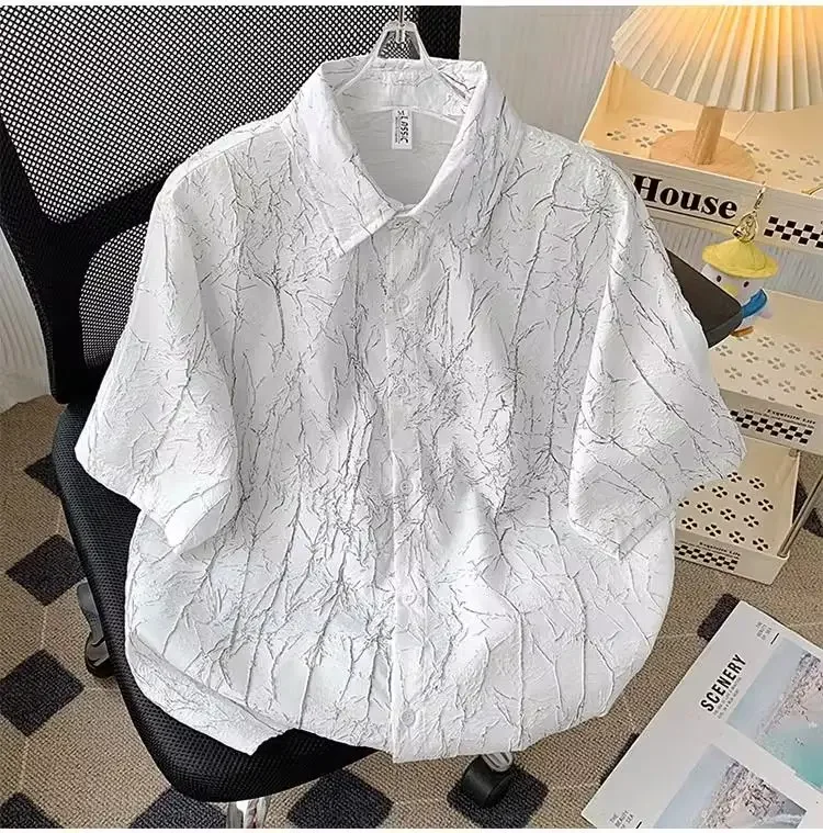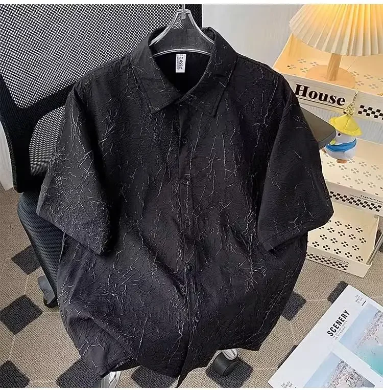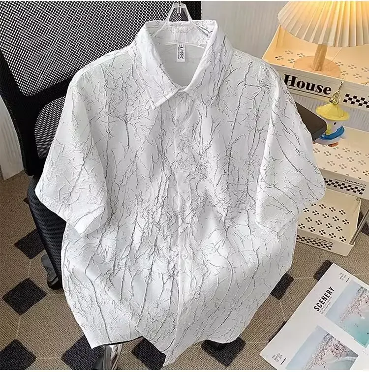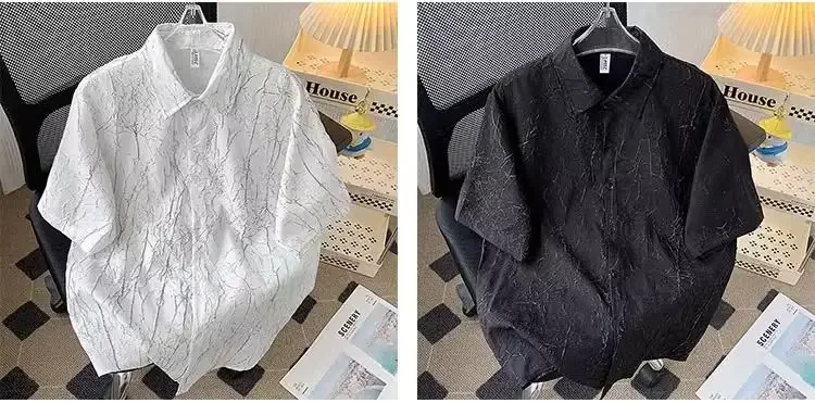HEARUJOY - Men Fashion High Street Vintage Luxury Jacquard Lapel Button Down Shirt Summer Casual Short Sleeve Loose Tops Camisas De Hombre