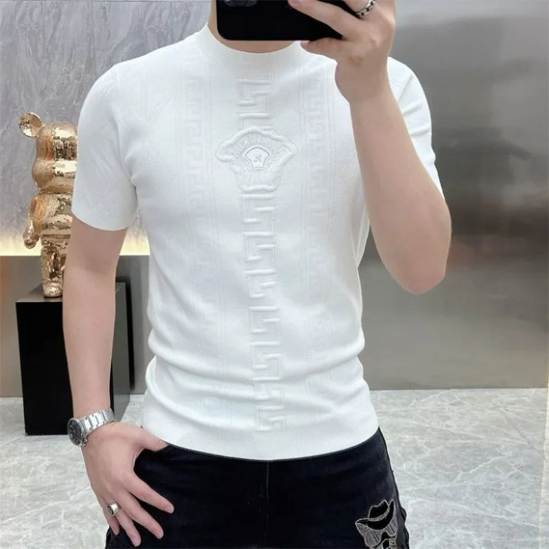 HEARUJOY - Men Korean Fashion Rhinestone Luxury Jacquard Knitted T Shirt Summer High Street White Round Neck Short Sleeve Slim Basic Tops