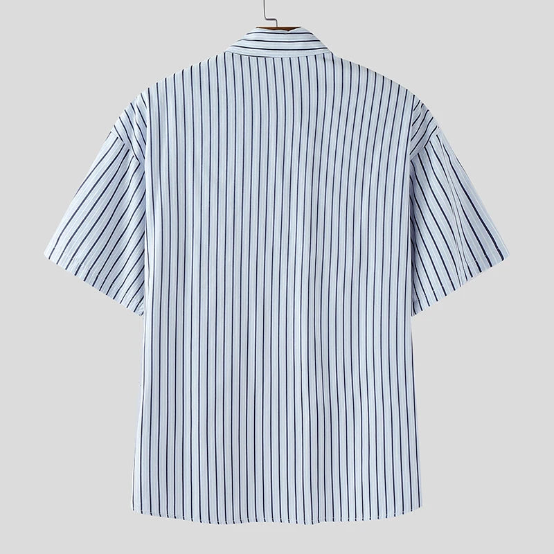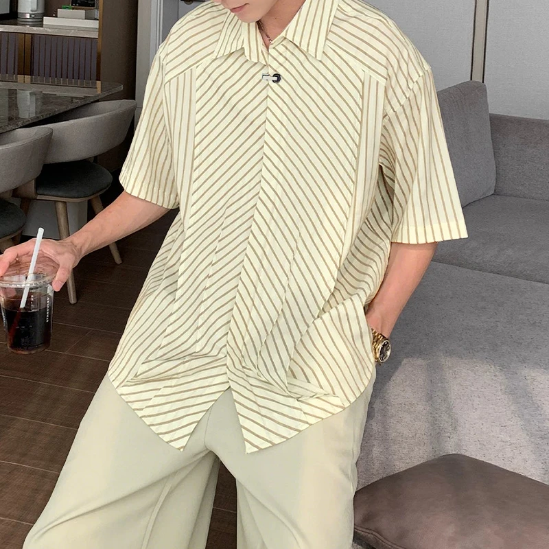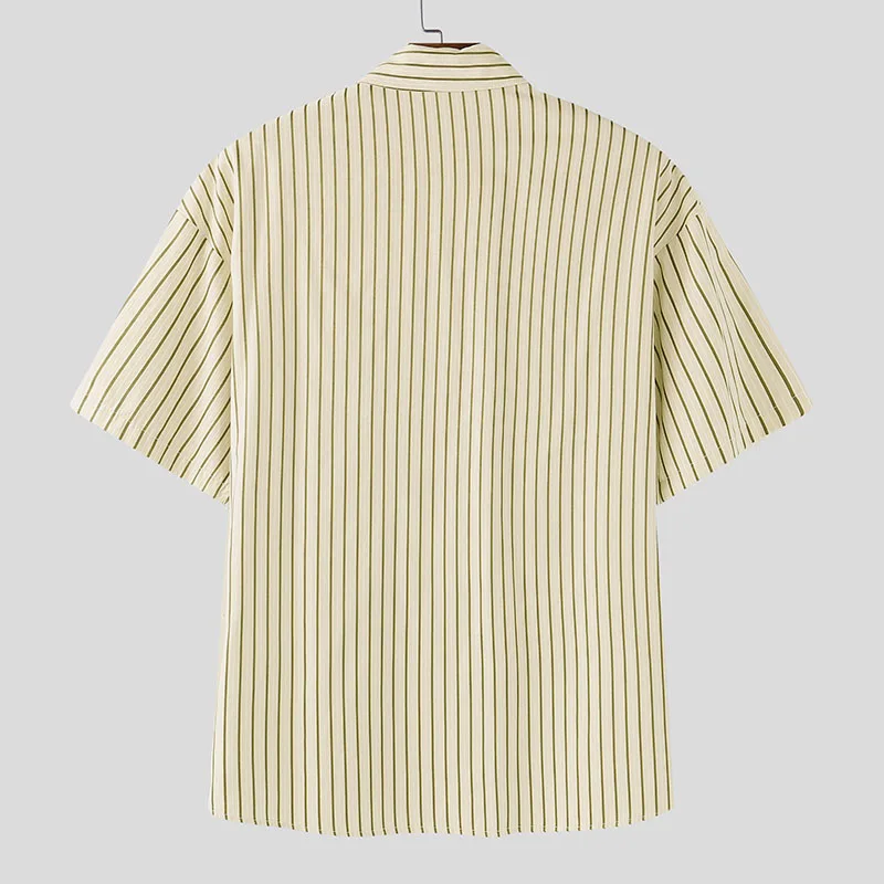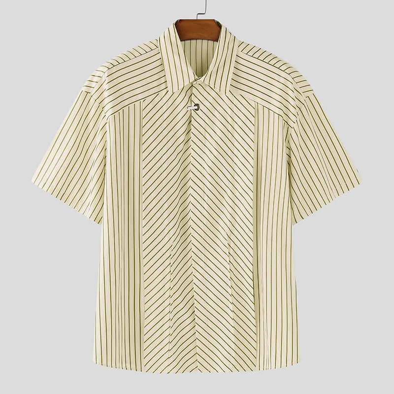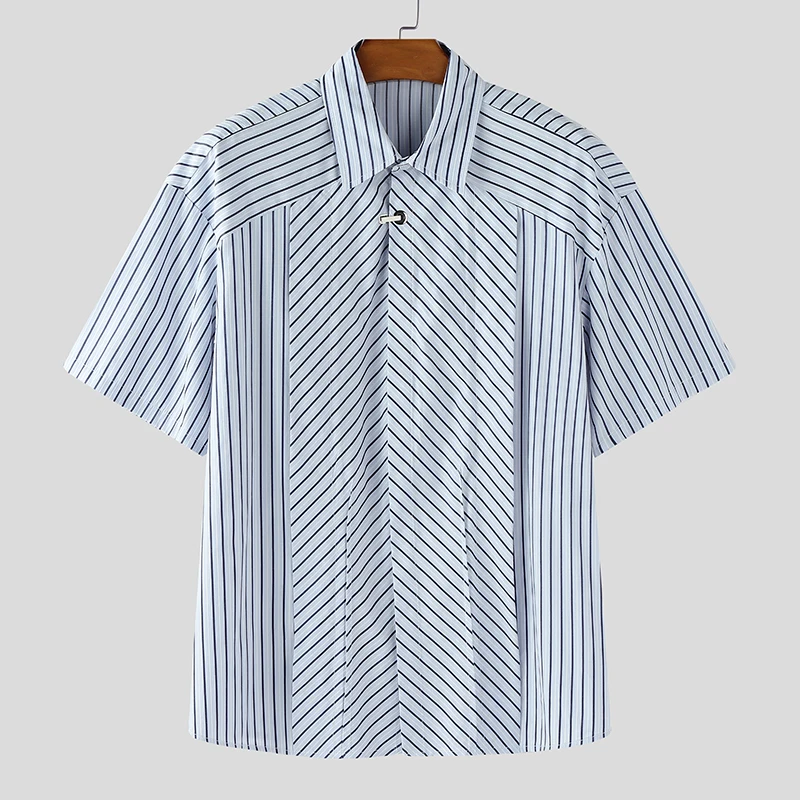 HEARUJOY - Men Shirt Striped Patchwork Lapel Short Sleeve Button Men Clothing Streetwear Korean Style Loose Fashion Casual Tops Men