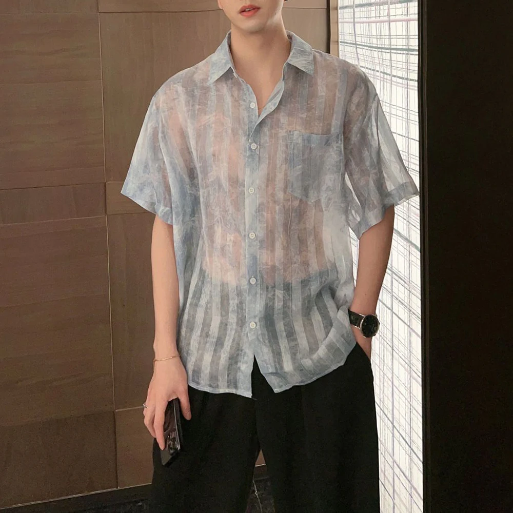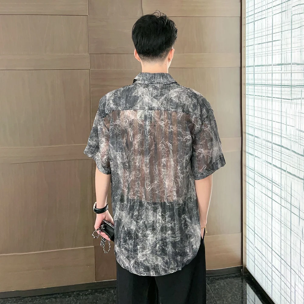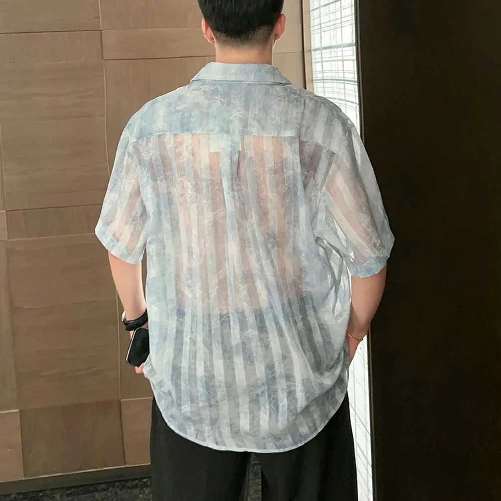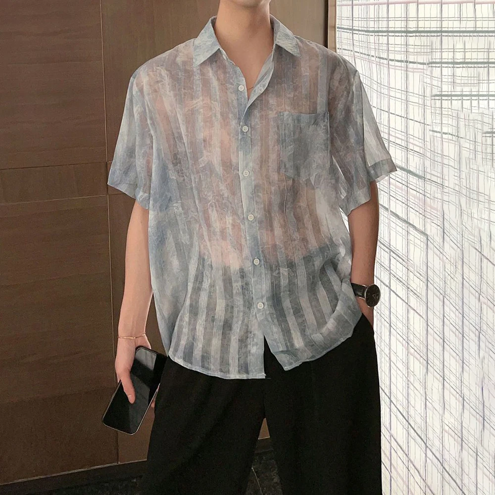 Hearujoy Men Striped See-Through Tie-Dye Mesh Short-Sleeve Casual Shirt 2024 New Genderless Fashion Night Club Sexy Loose Shirt Unisex