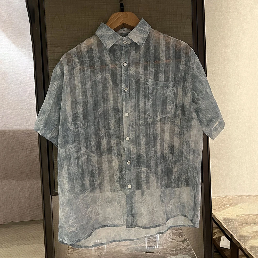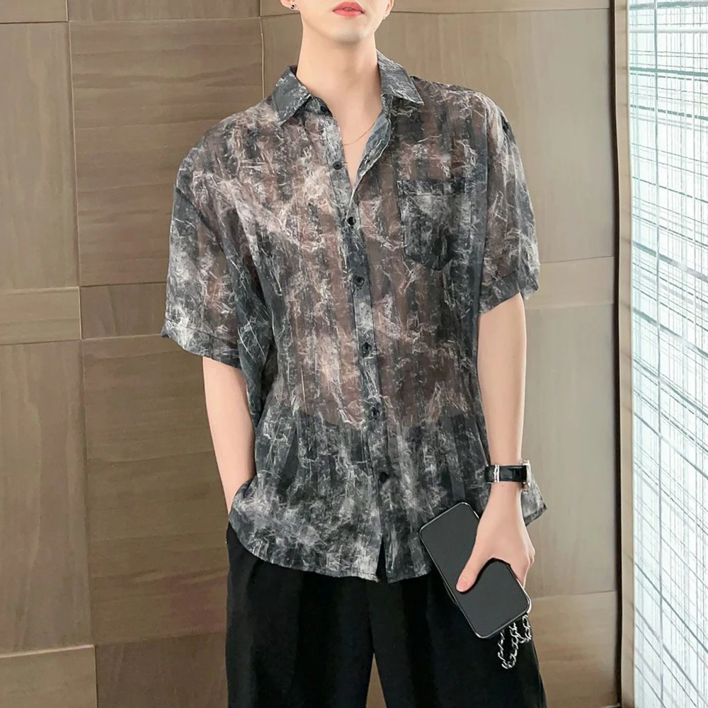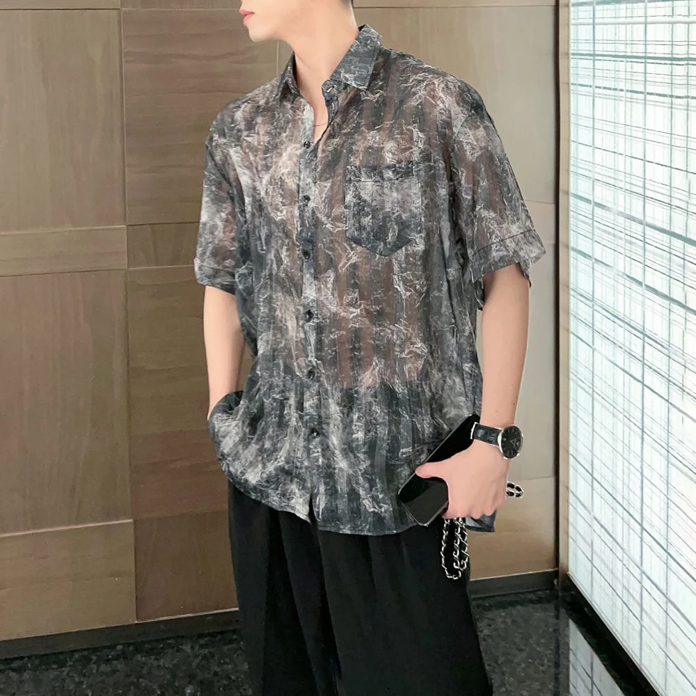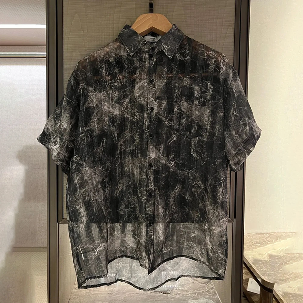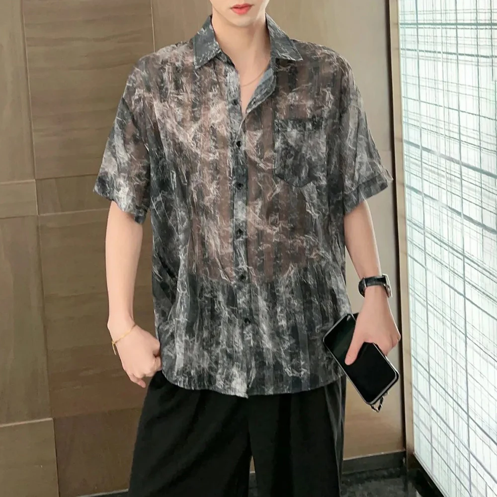 Hearujoy Men Striped See-Through Tie-Dye Mesh Short-Sleeve Casual Shirt 2024 New Genderless Fashion Night Club Sexy Loose Shirt Unisex