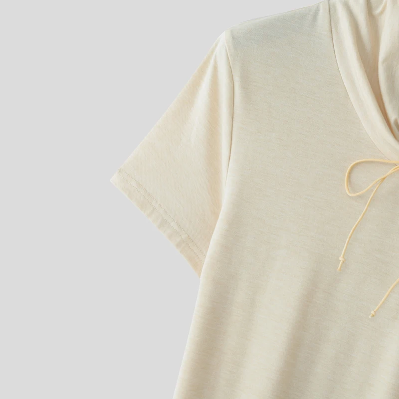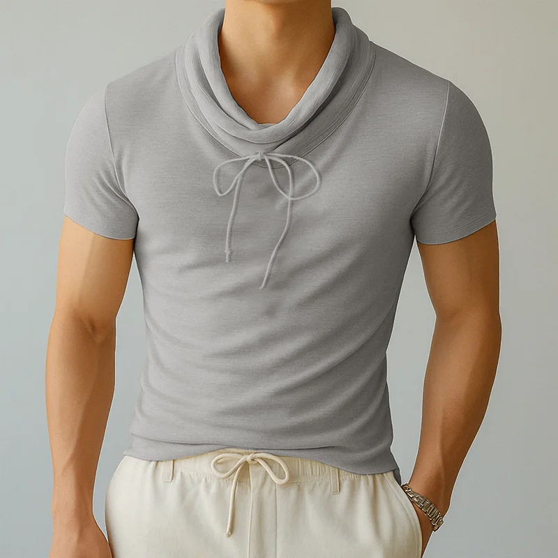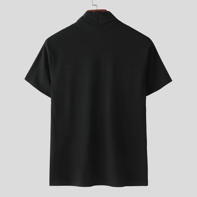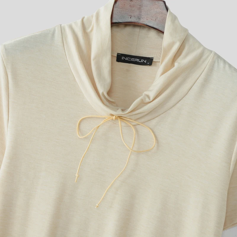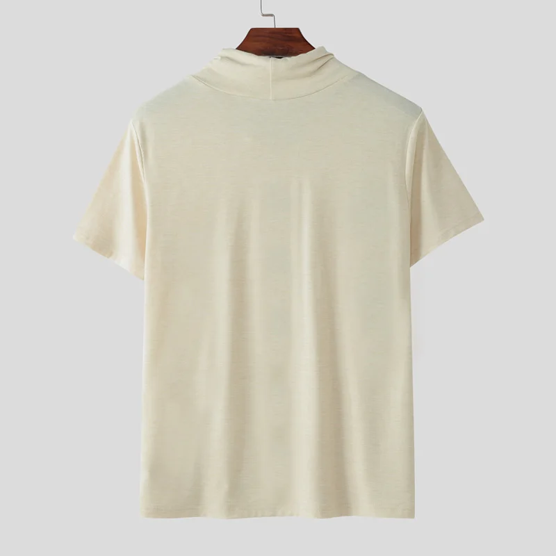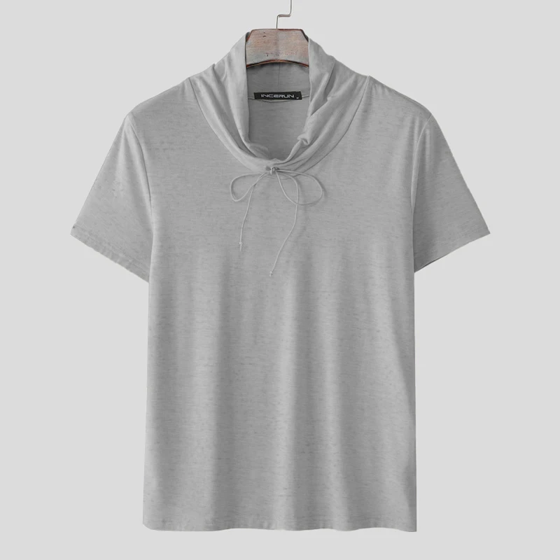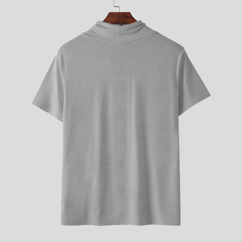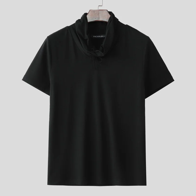 HEARUJOY - Men T Shirt Solid Color Drawstring Turtleneck Short Sleeve Male Tee Tops Streetwear Summer Fashion Men Clothing