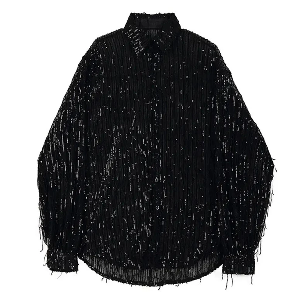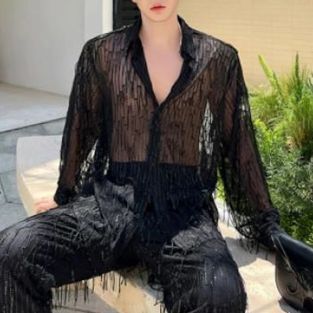 Hearujoy Men Tassel See-Through Sexy Sequined Long-Sleeve Shirt Autumn Genderless Fashion Nightclub Street Stage Performance Shirt Unisex