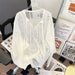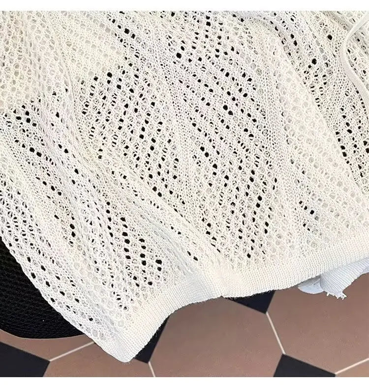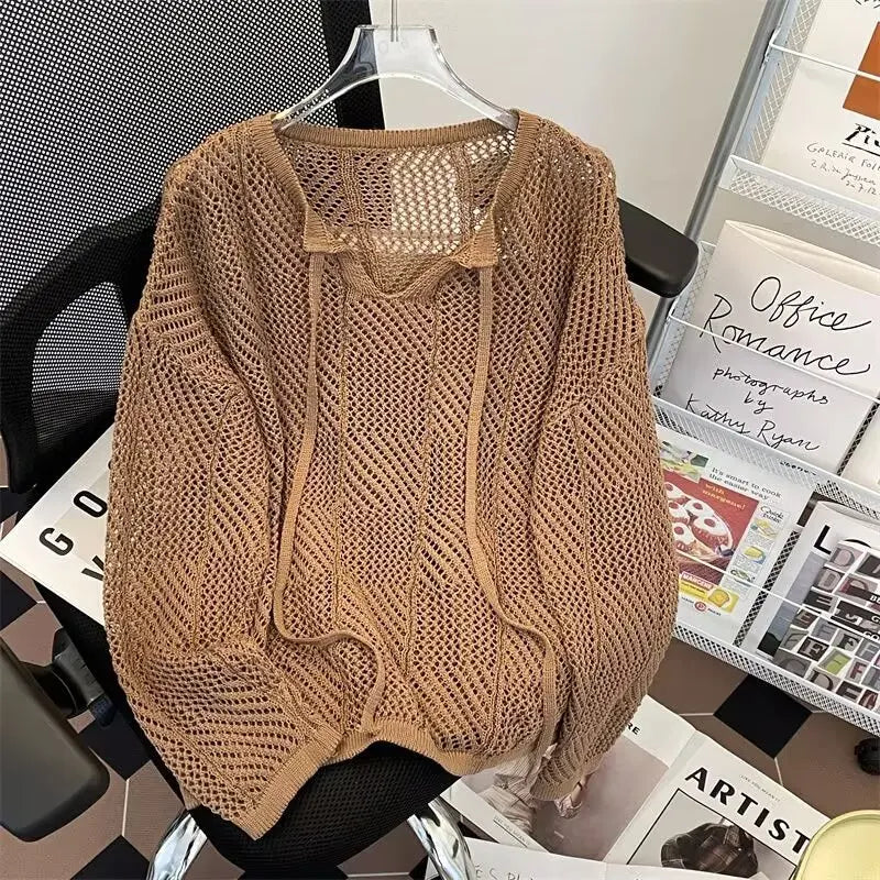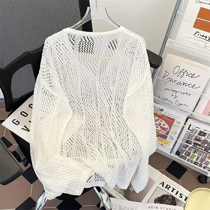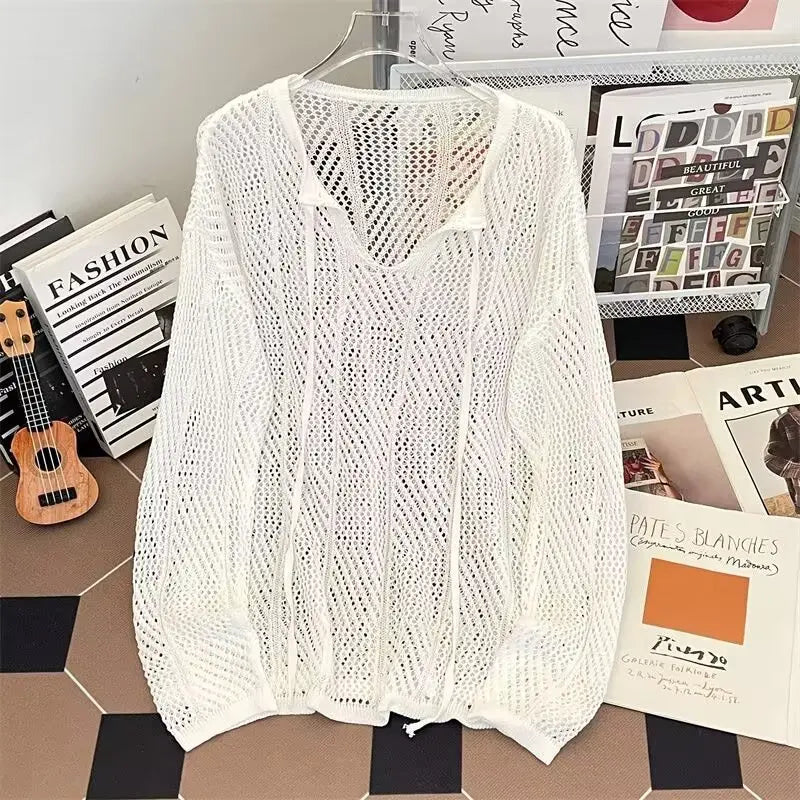 HEARUJOY - Men V-neck Long Sleeve Knit Shirts Loose Elastic Hollow knit Sweater T-shirt Slightly Transparent Knitted Sweaters Streetwear