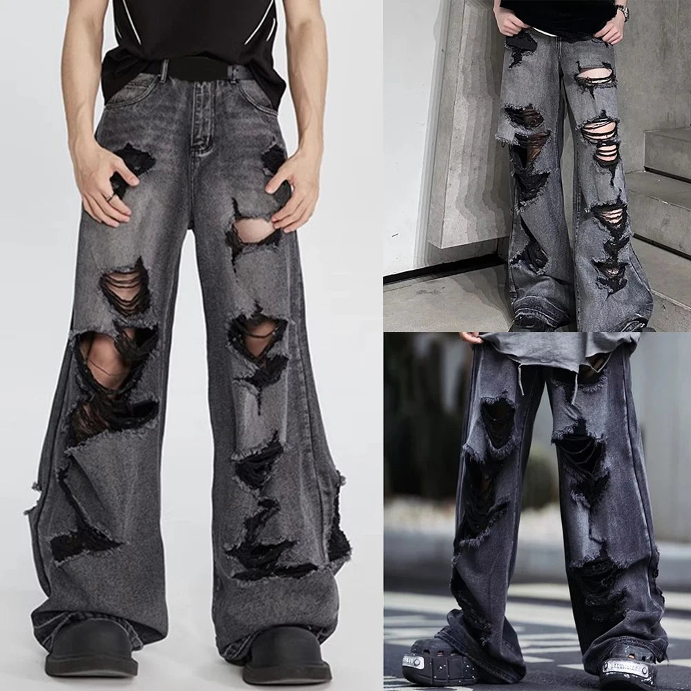 HEARUJOY - Men Vintage High Waist Baggy Hole Pants Fashion Hip Hop Gothic Wide Leg Jeans Casual Loose Trouser 2025