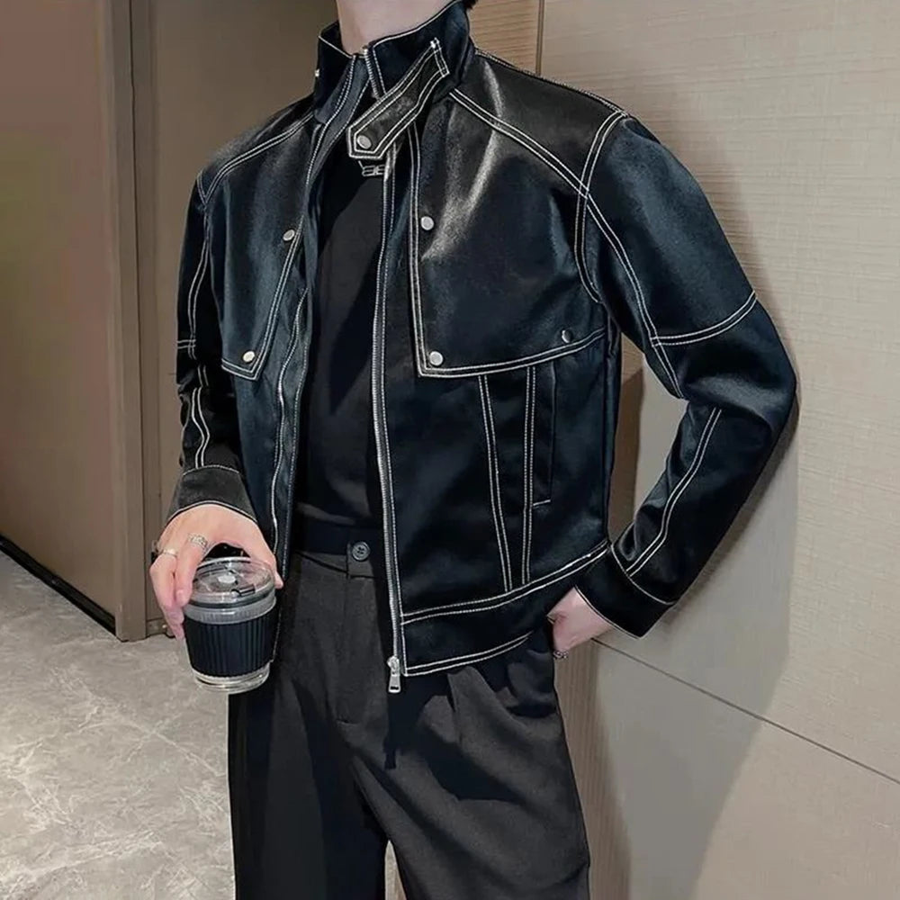 Hearujoy Men Y2k Matte Biker Leather Jacket Genderless Autumn Winter Nightclub Trendy Street Stand Collar Topstitch Leather Jacket Unisex