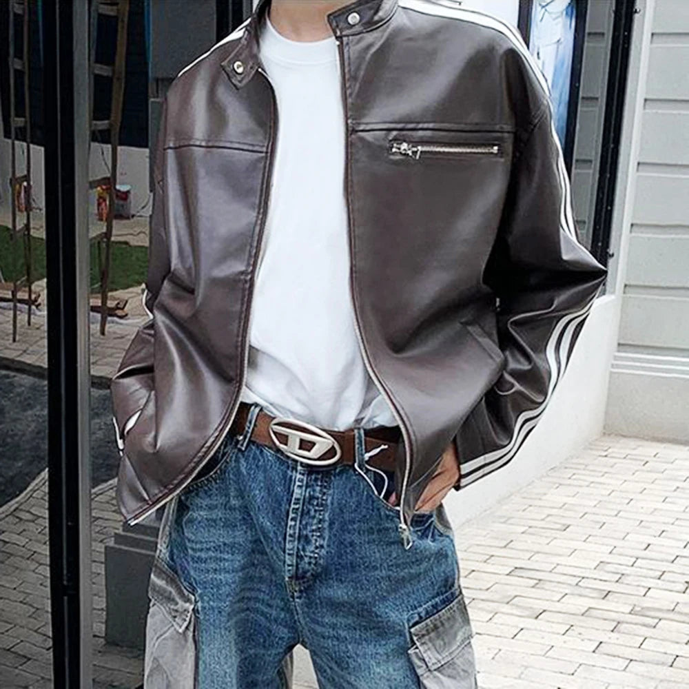 Hearujoy Mens Autumn Biker White Stripe Maillard Leather Jacket Genderless Trendy Retro Casual Street Simple Leather Jacket Unisex