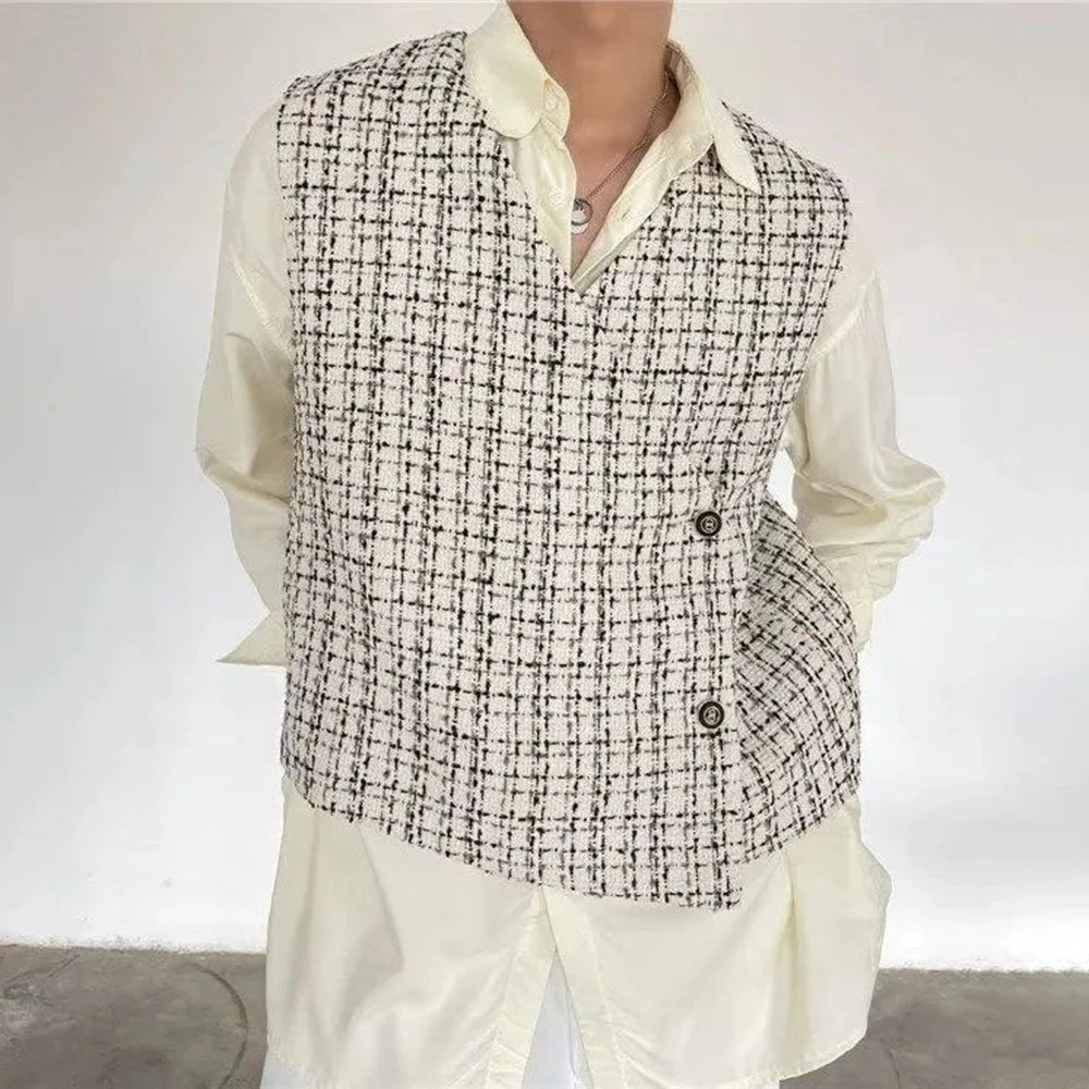 Hearujoy Mens Autumn French Style Outer Plaid Vest New Fashion Elegant Retro Casual Loose Comfortable Simple Side Placket Short Vest