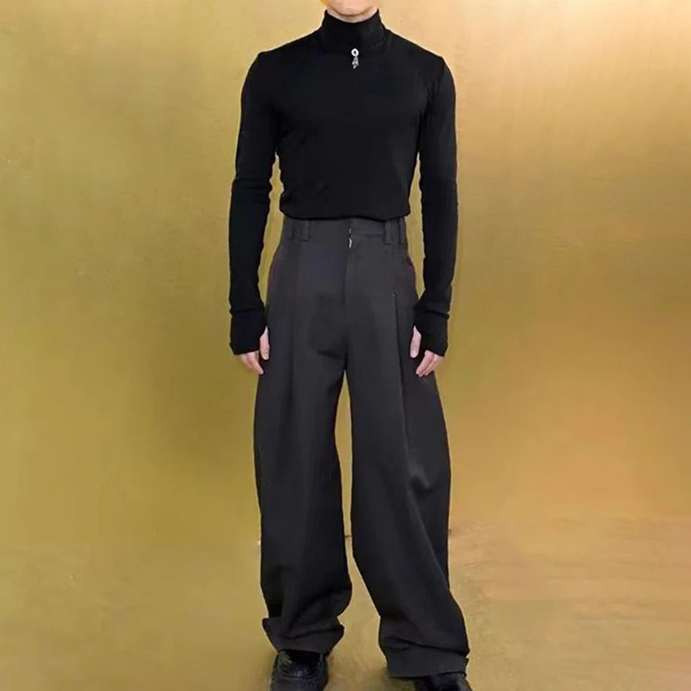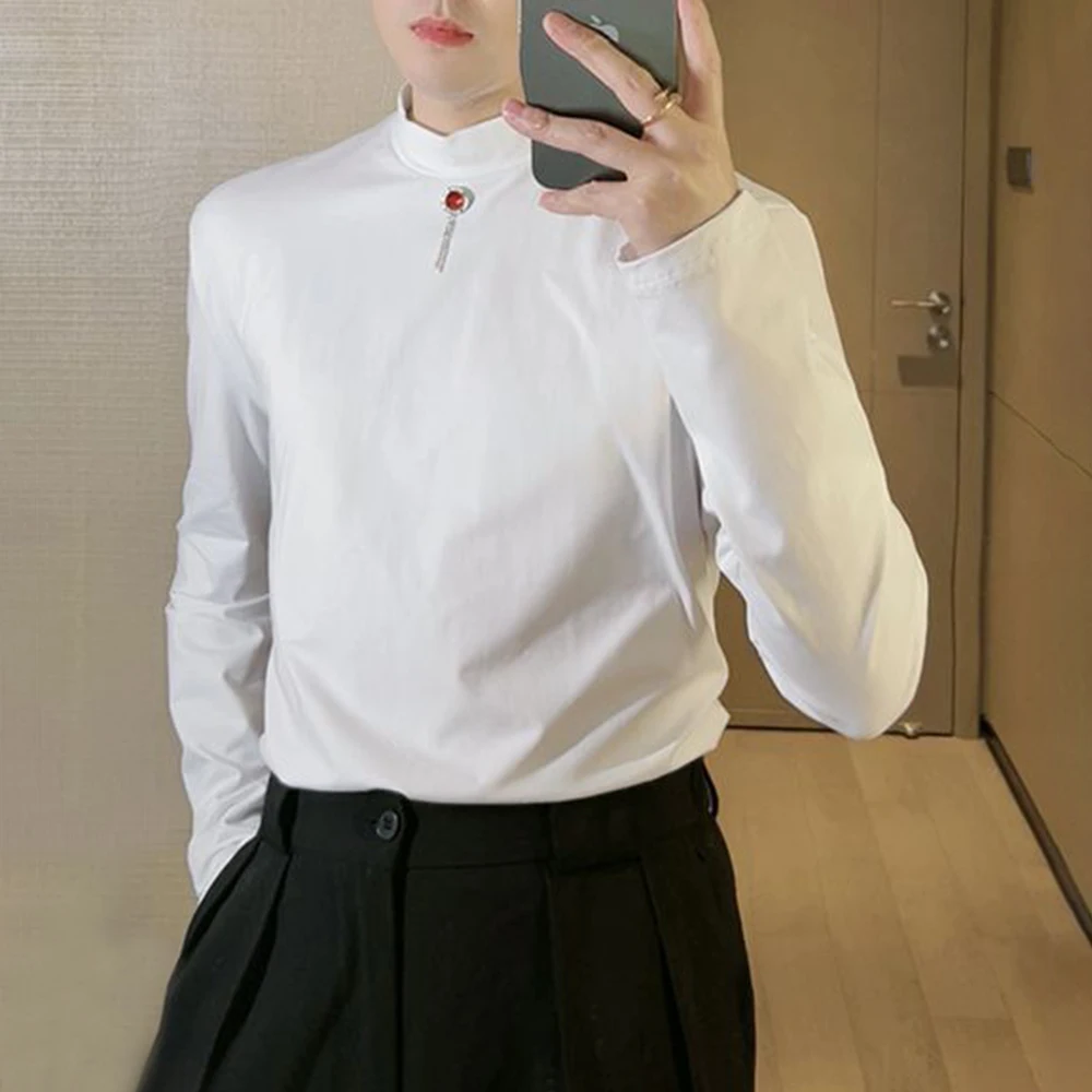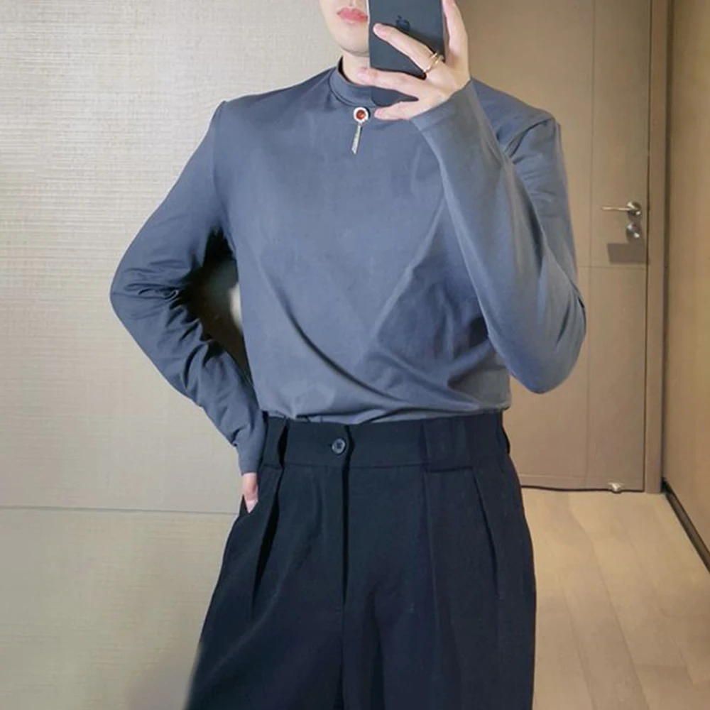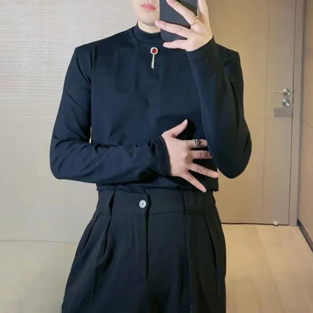 Hearujoy Mens Autumn Solid Color Half-High Collar Slim Fit Top Essential Youth Trend Niche Dark Style Sexy Simple Long-Sleeved T-Shirt