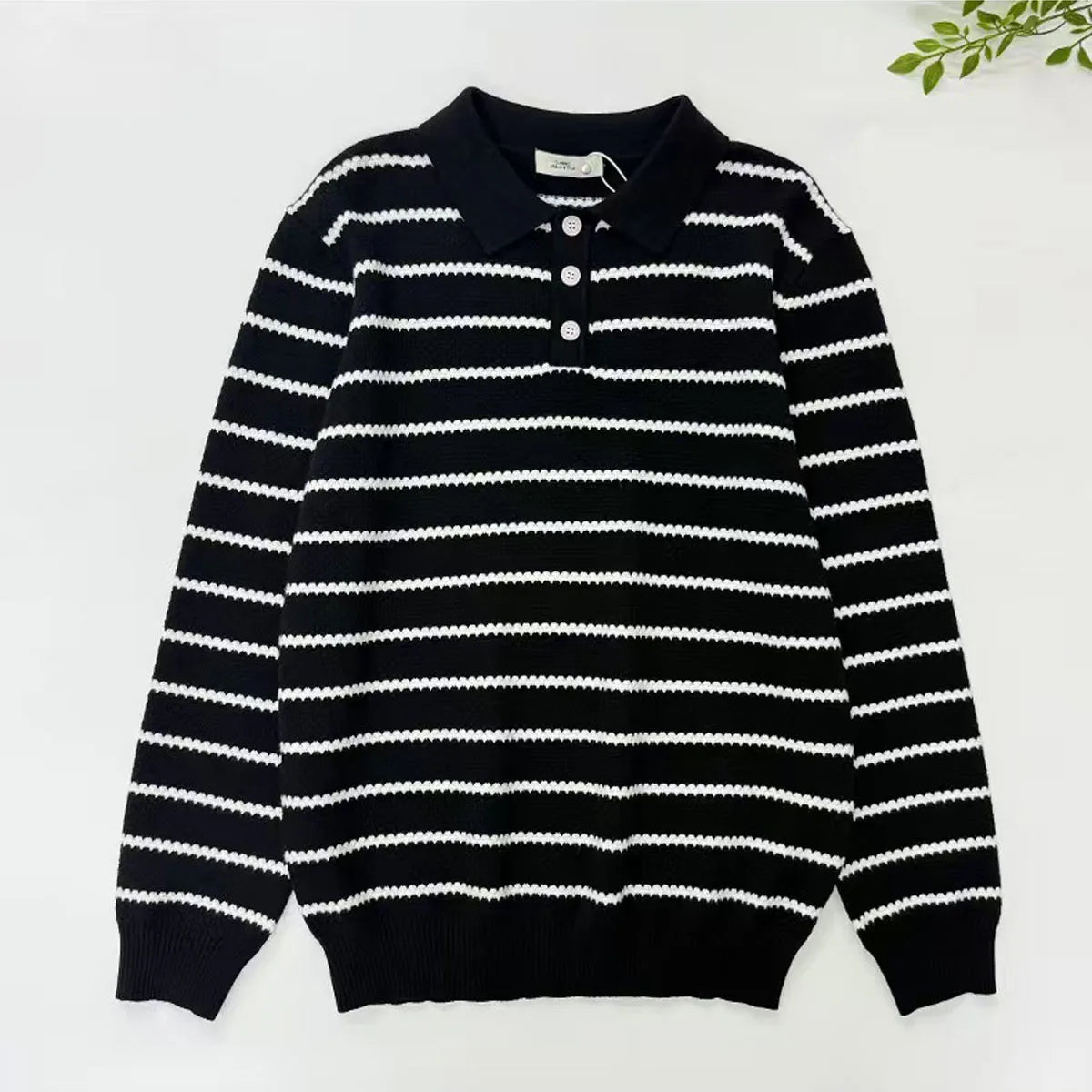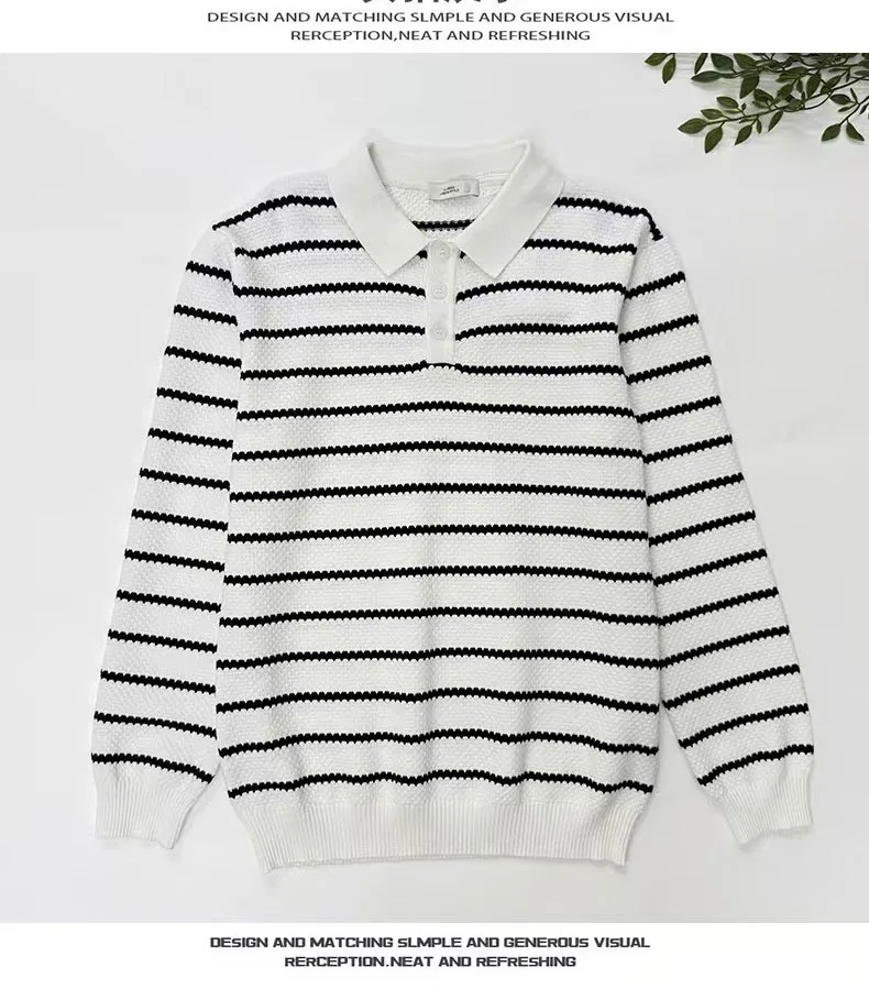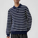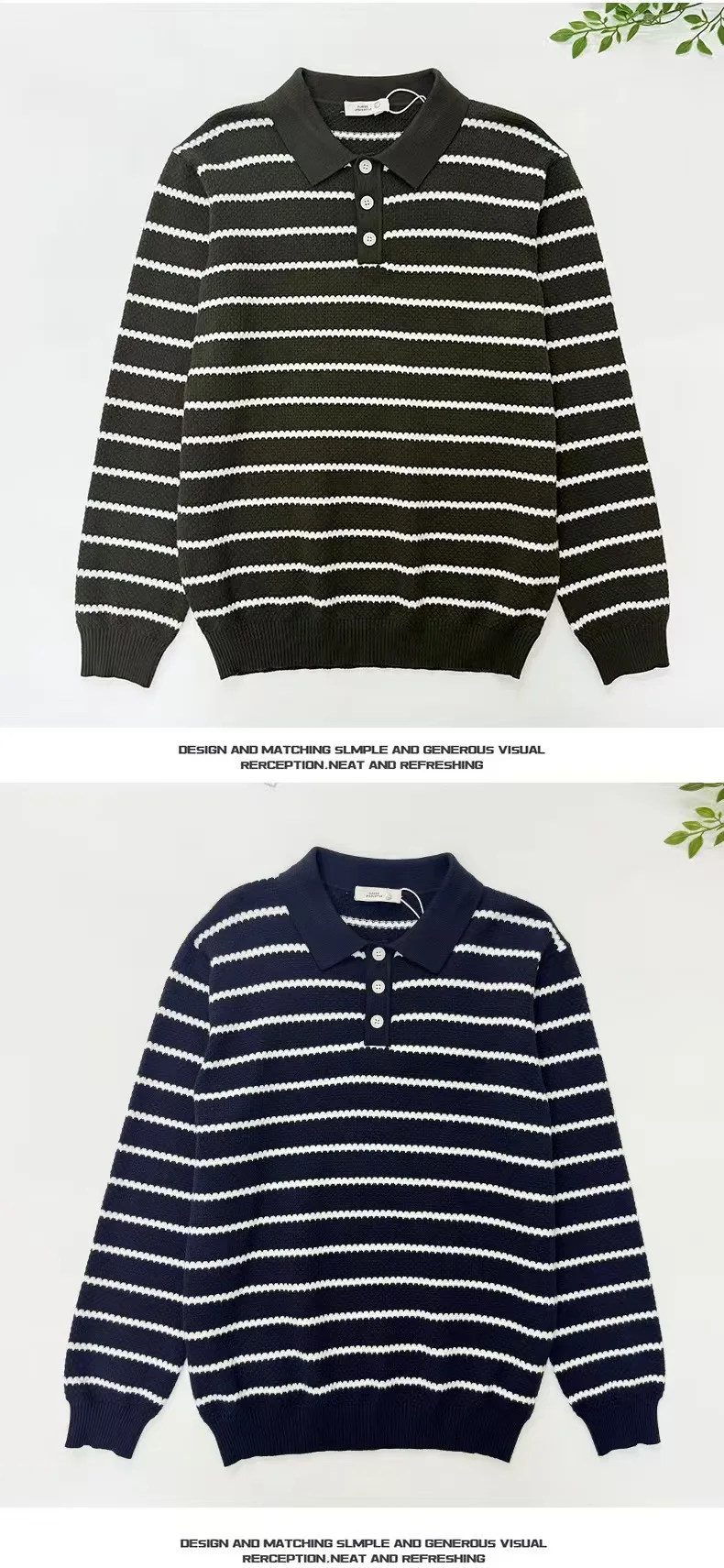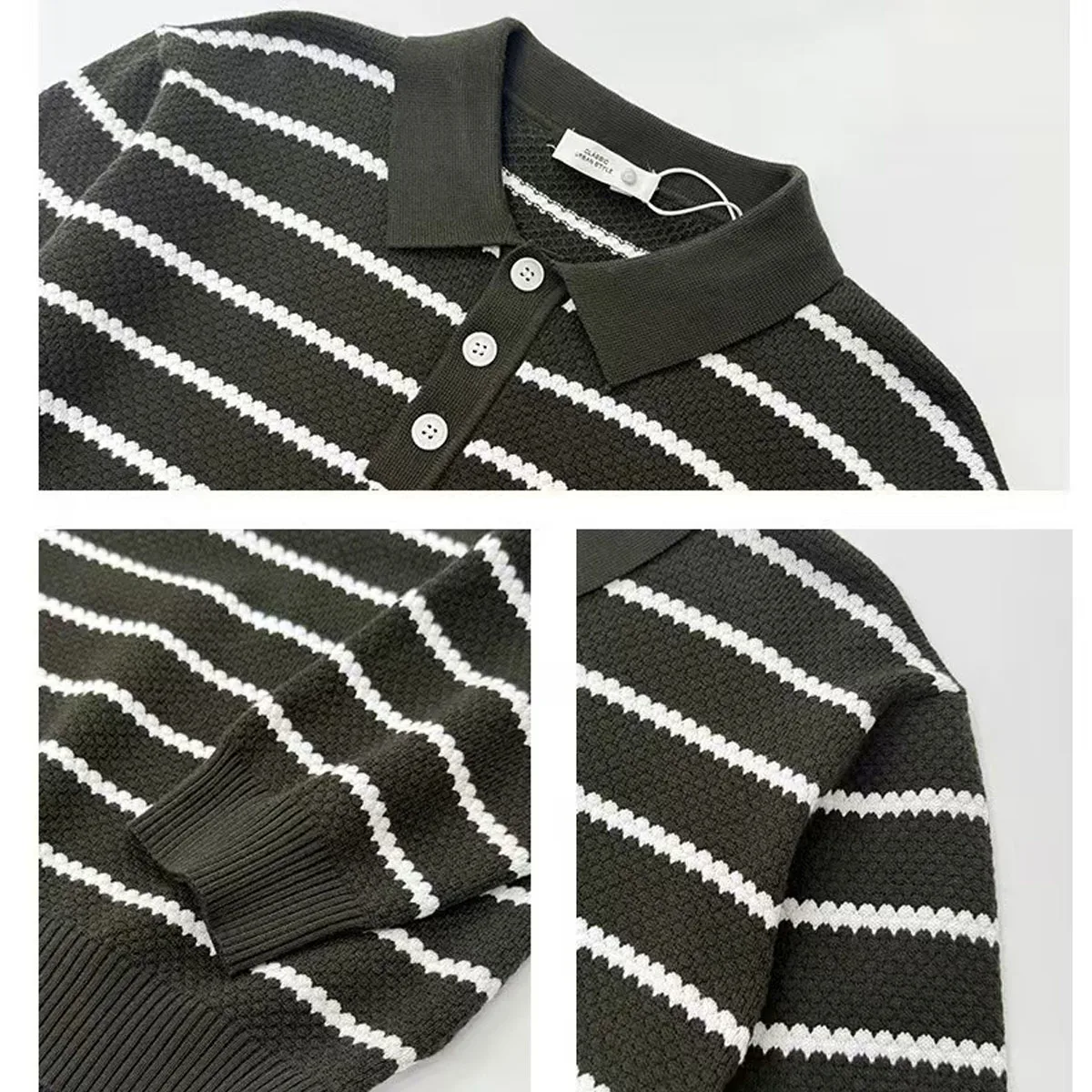 HEARUJOY - Men's Button Polo Collar Business Stripe Pullover Sweaters Streetwear Fashion Loose Casual Vintage Knitted Sweater For Male Tops