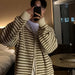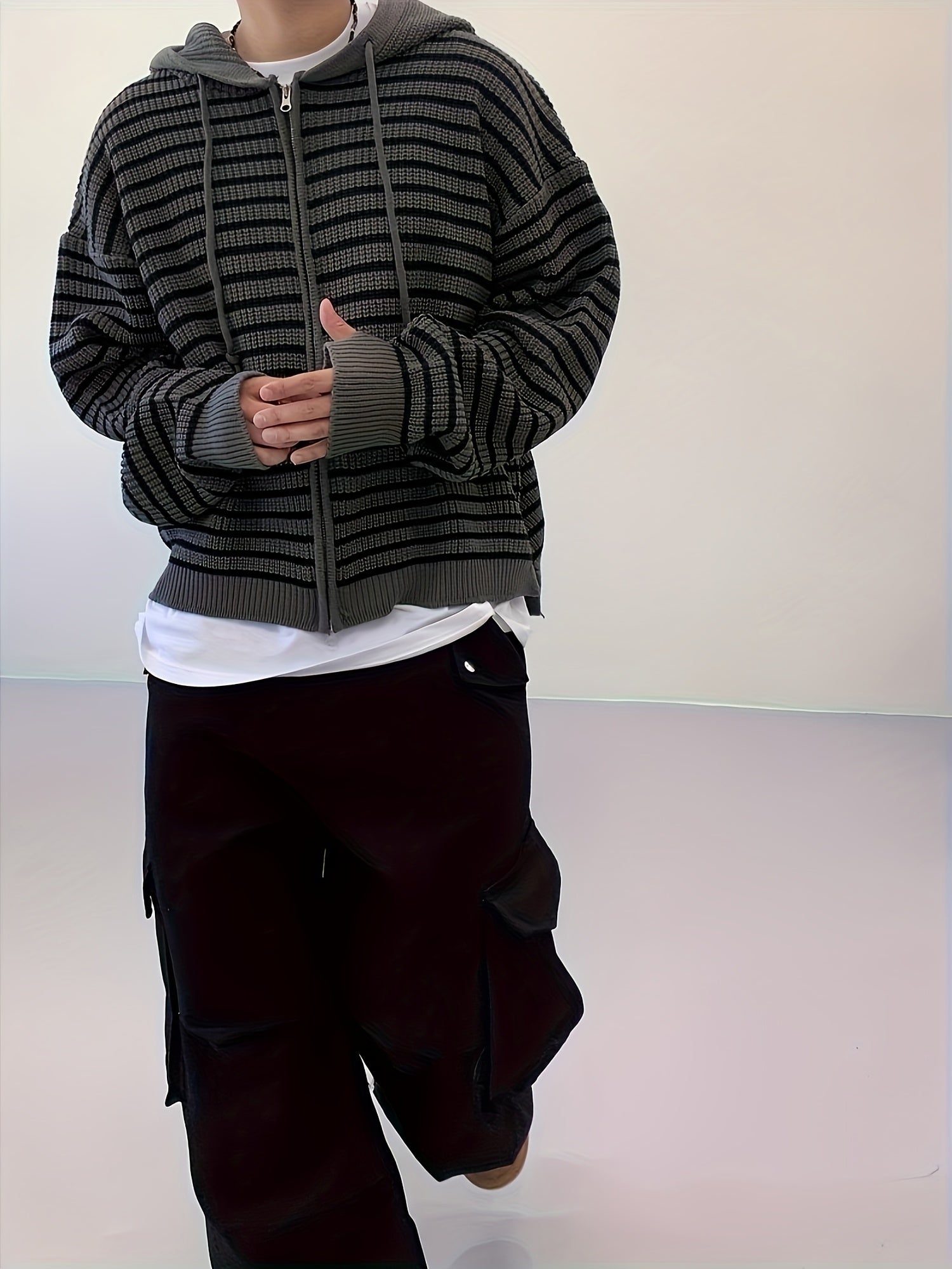 HEARUJOY - Men's Casual Striped Hooded Knit Cardigan - Soft Acrylic Zip-Up Sweater, Loose Fit for All Seasons, Black & White Vertical Stripes, Perfect for Commuting or Leisure Outings, Allseason Sweater | Zipup Cardigan | Soft Cardigan, Lightweight Cardigan
