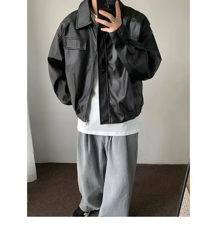 HEARUJOY - Men's Casual Texture PU Leather Jacket High Street Zippers Turn-down Collar Long Sleeve Retro Coat with Pocket Spring Autumn