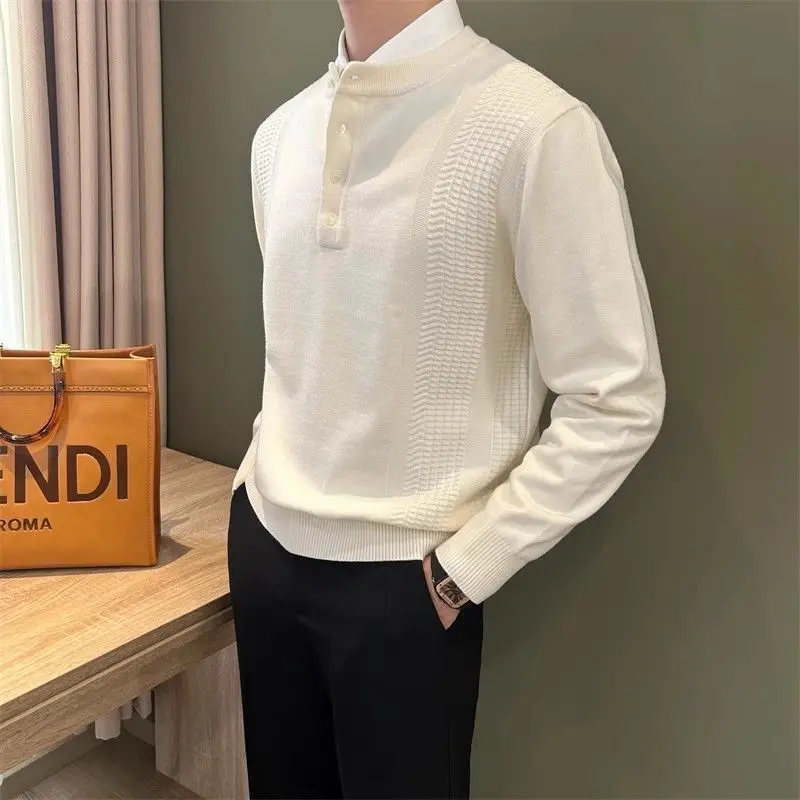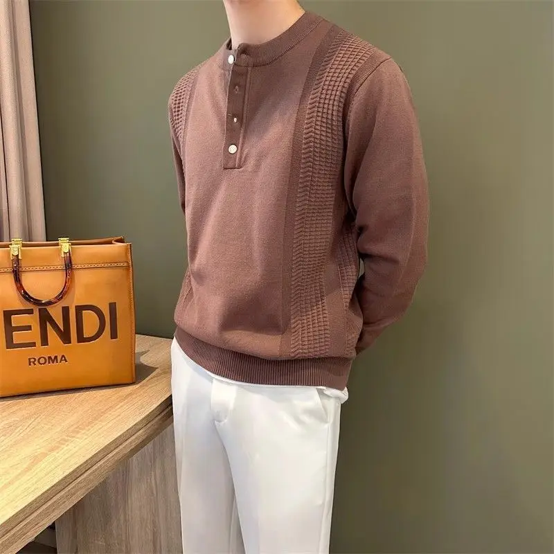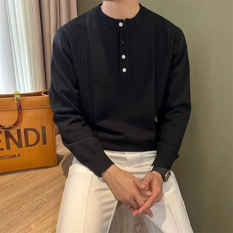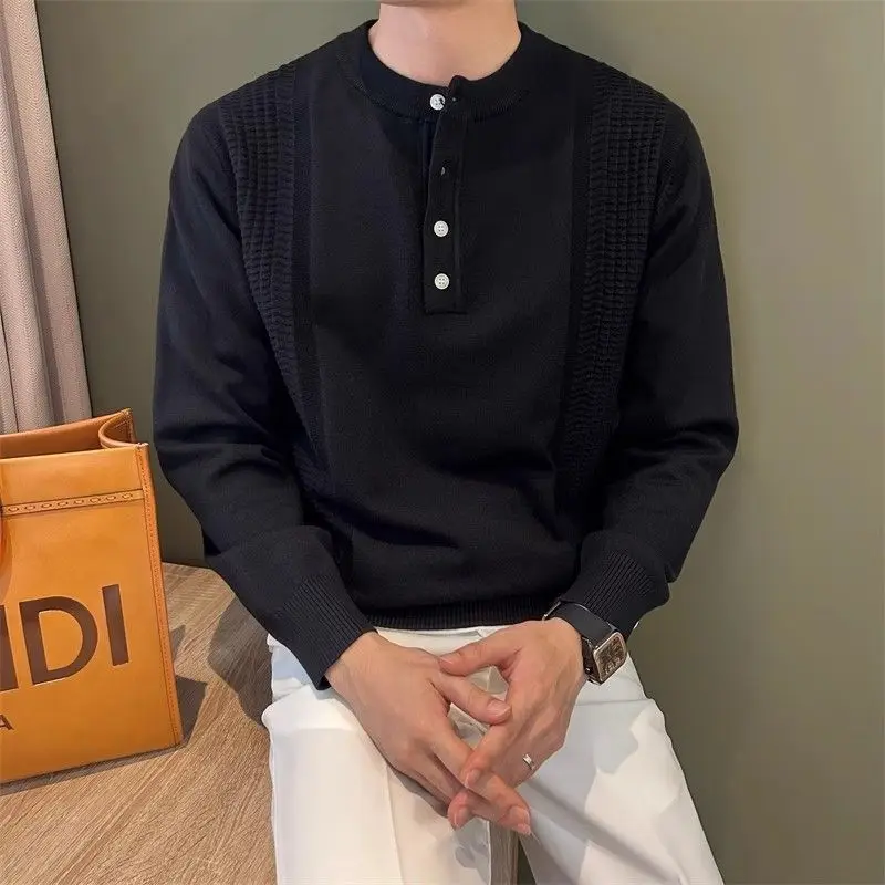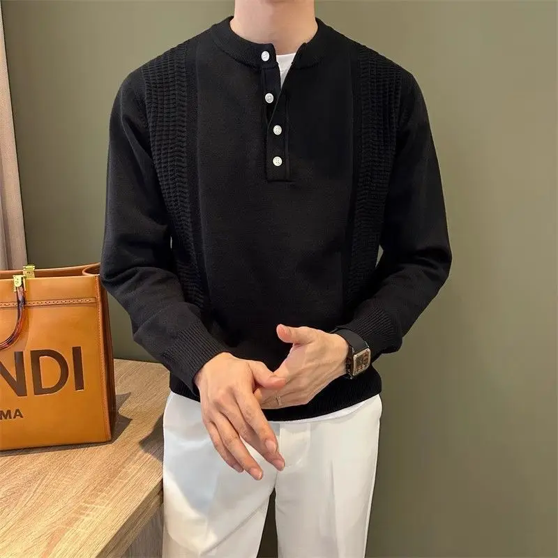 Hearujoy Men's Clothing Vintage Fashion Henry Collar Business Casual Knitted Sweater Autumn Winter Solid Long Sleeve Loose Pullover Tops