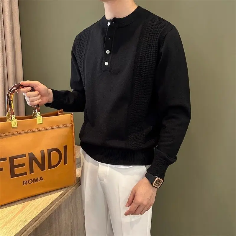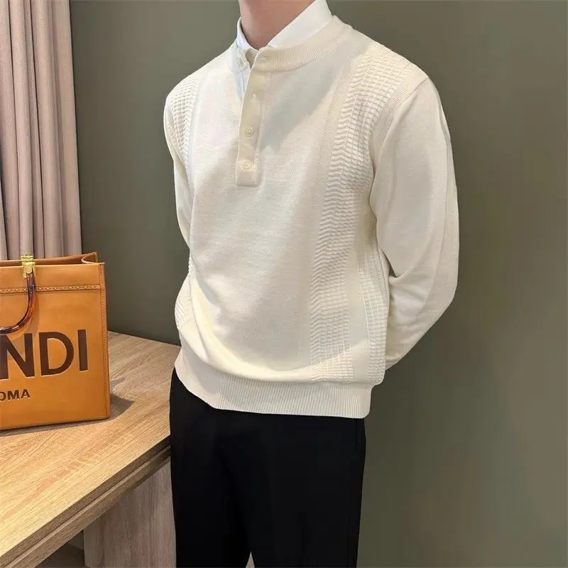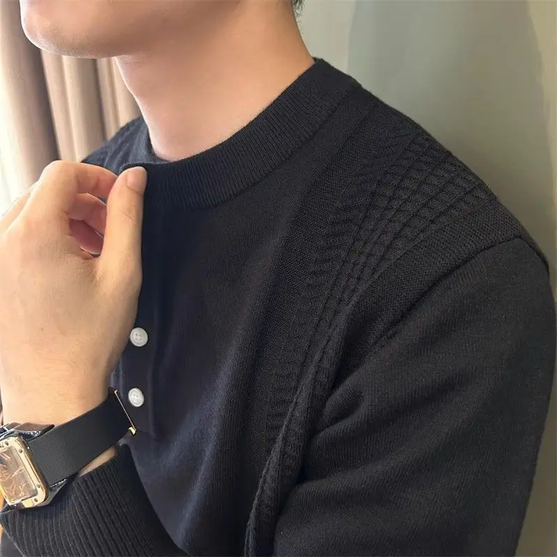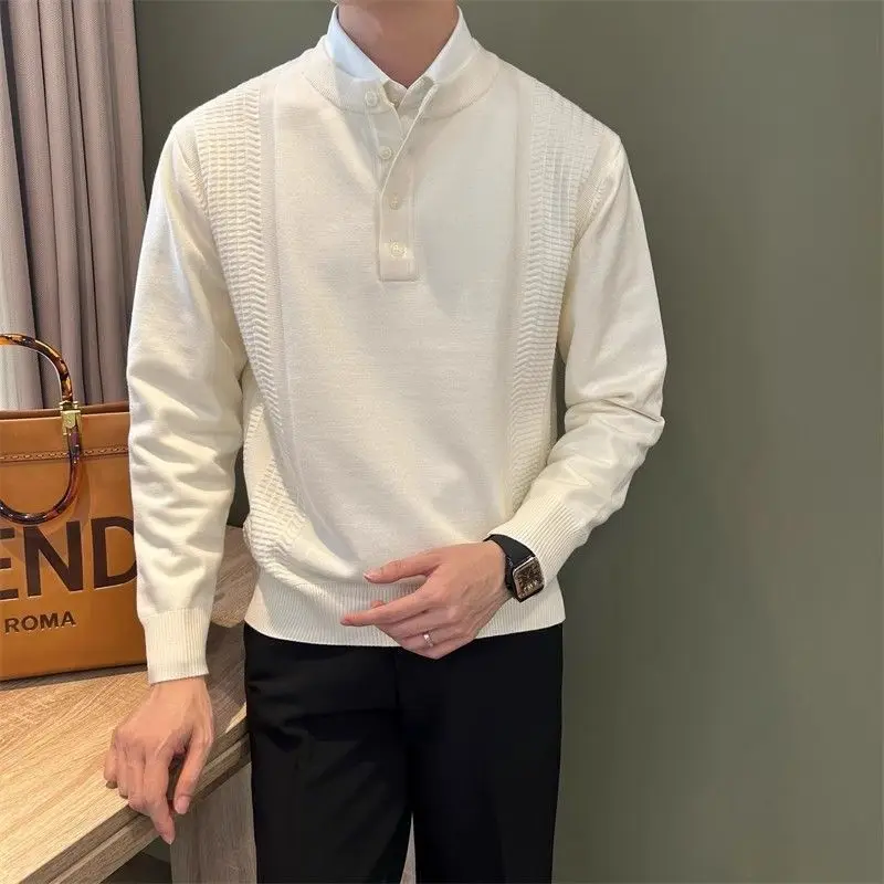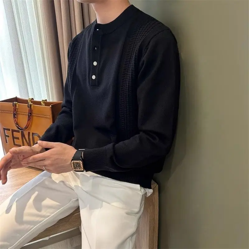 Hearujoy Men's Clothing Vintage Fashion Henry Collar Business Casual Knitted Sweater Autumn Winter Solid Long Sleeve Loose Pullover Tops
