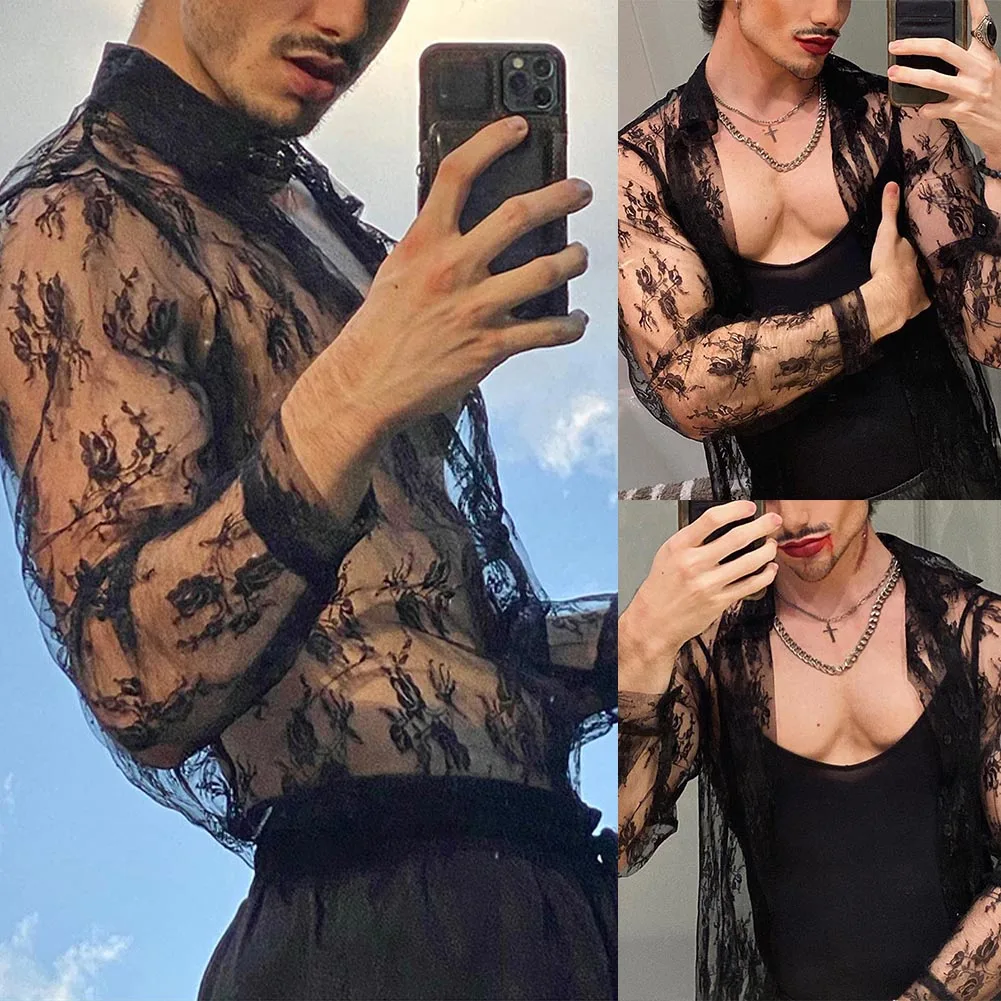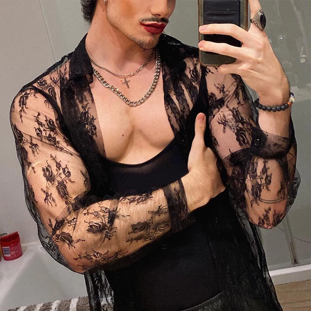 HEARUJOY - Mens esh Tops See Through Long Sleeve Floral Clubwear Party Tee Blouse Polyester Black Fit M~2XL Casual Button Down Shirts