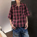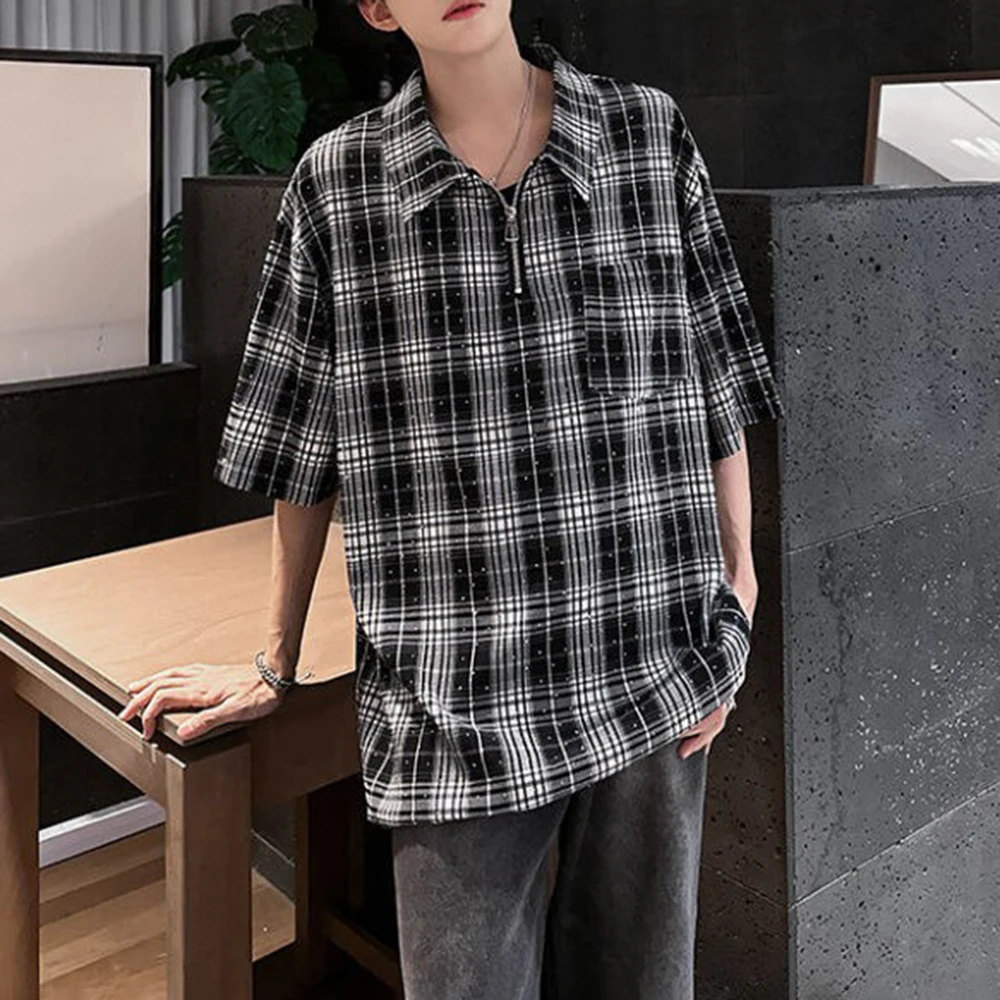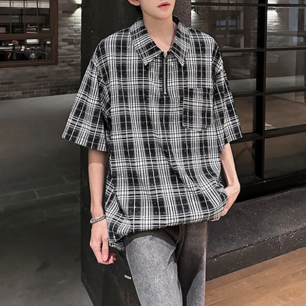 HEARUJOY - Mens Hot Diamond Plaid Half-Zip Casual Shirt Streetwear Fashion Youth Campus Versatile Short-Sleeve Tops Men'S Clothing 2025 New