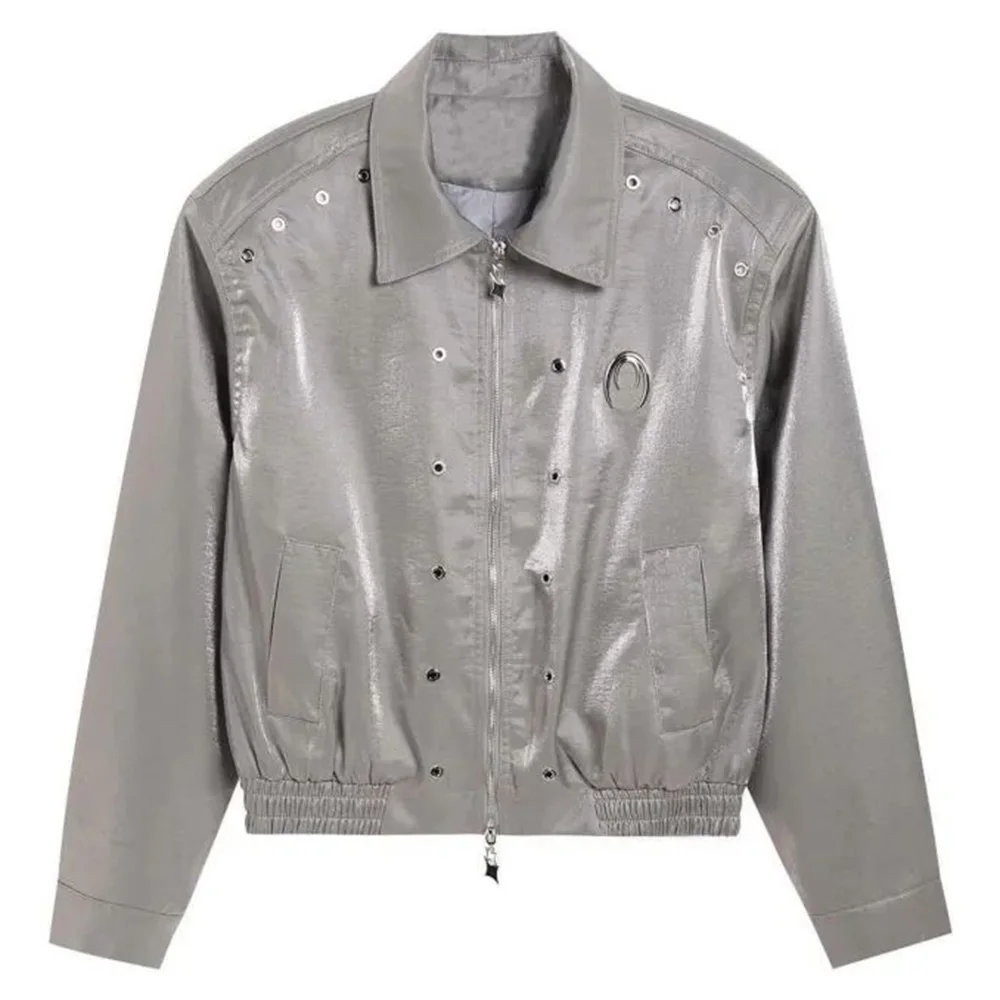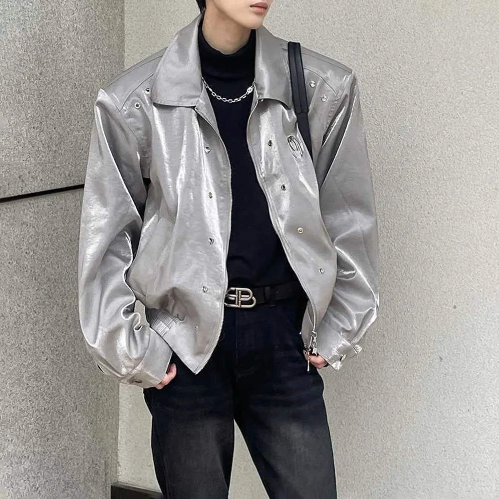 Hearujoy Men's Leather Outerwear Y2k Clothes Trend Streetwear Faux Leather Glossy Long Sleeve Jackets Motorcycle Zipper Short Tops Coat