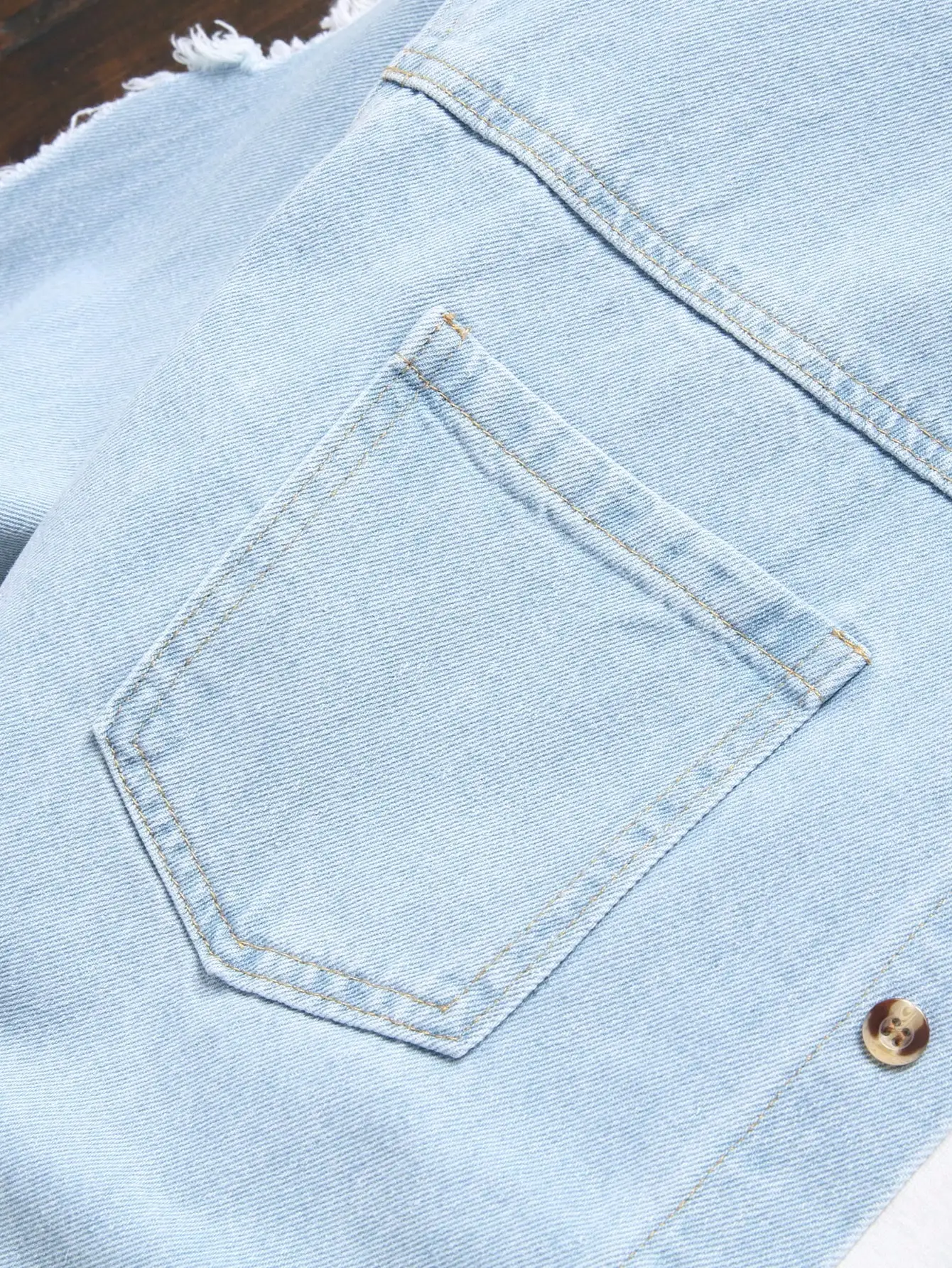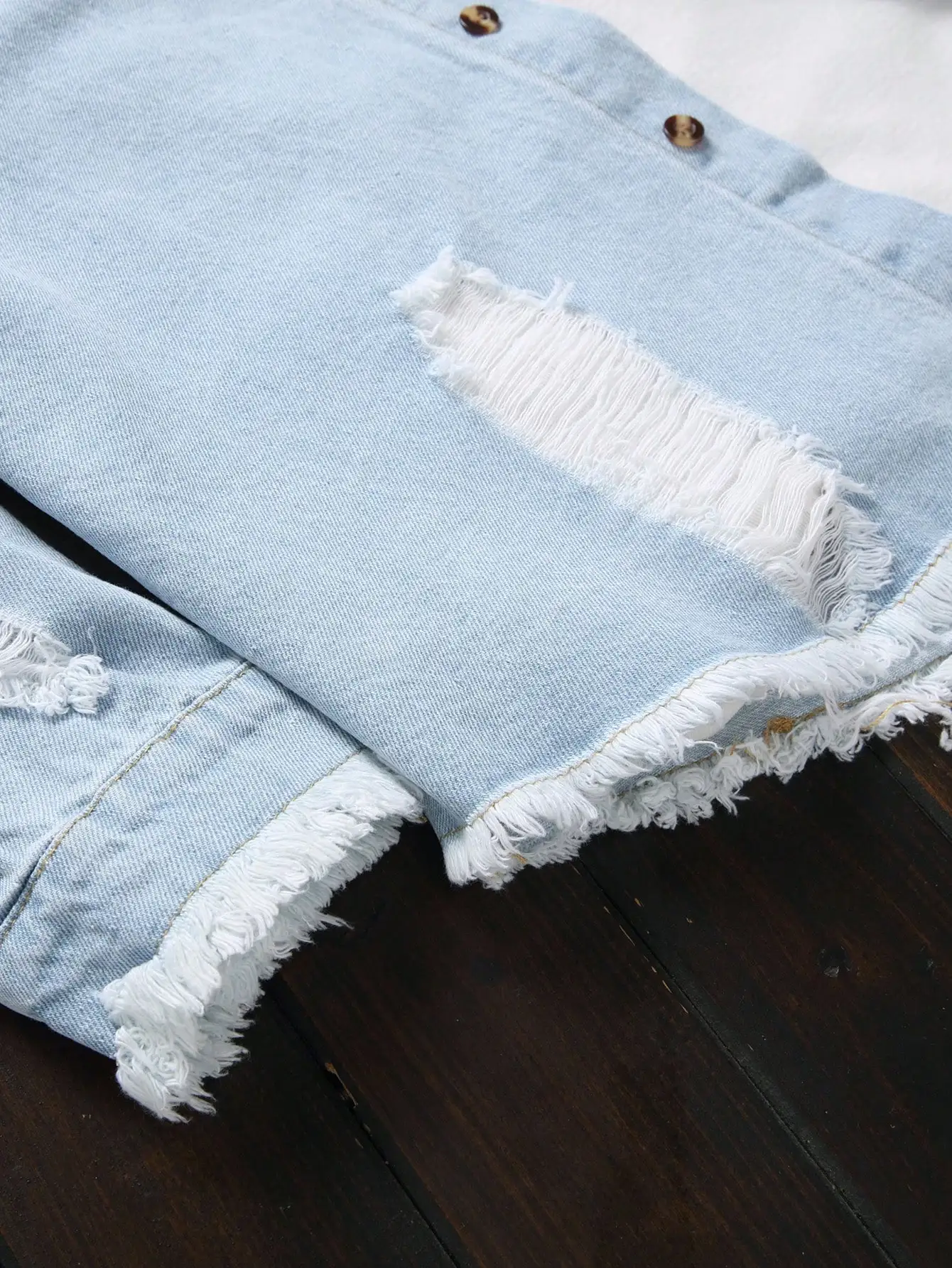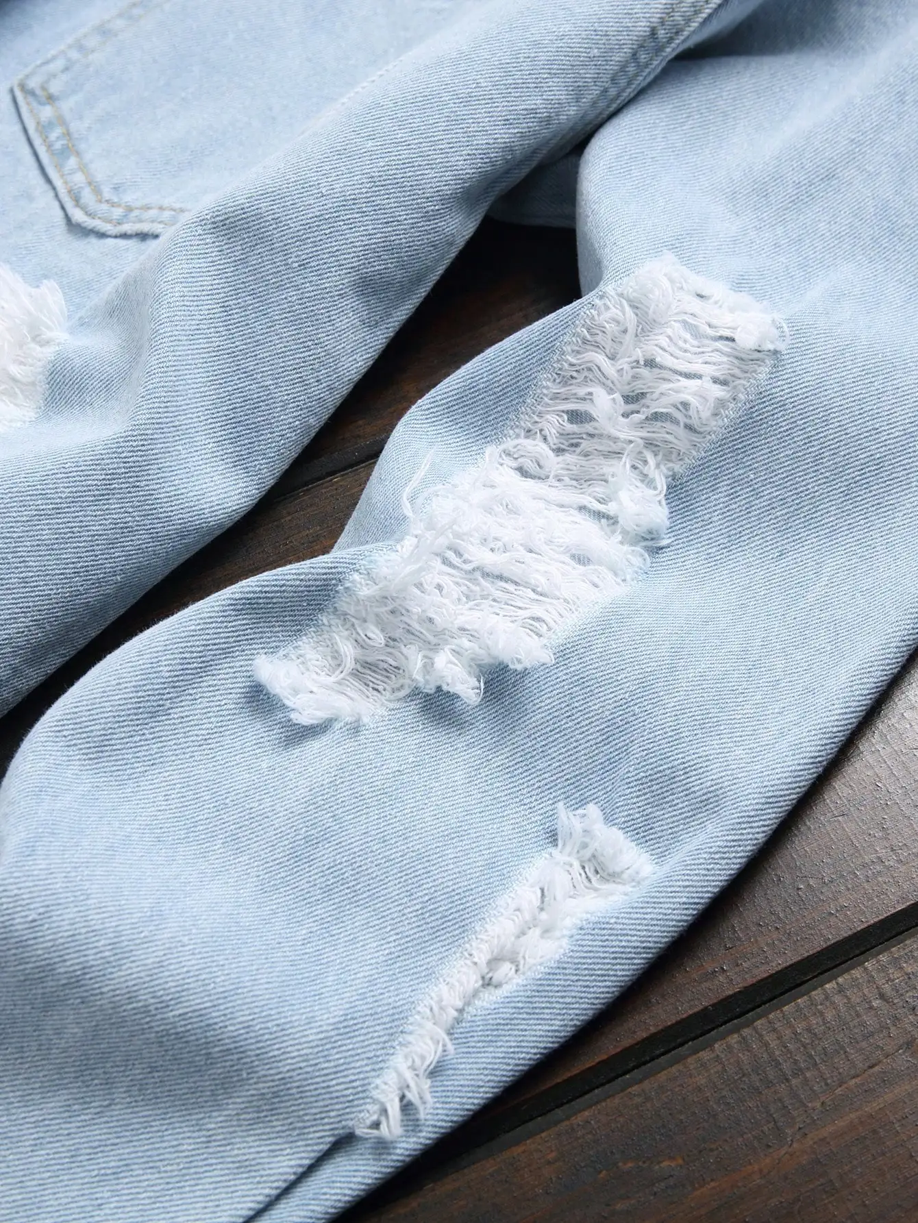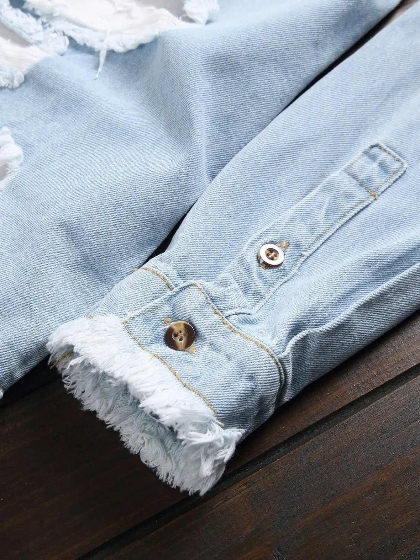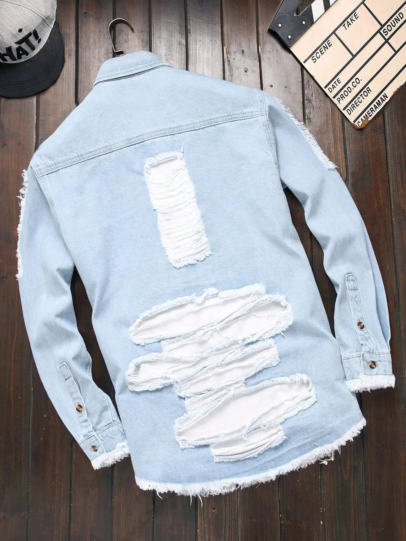 HEARUJOY - Men's Light Blue Ripped Distressed Washed Denim Long - Sleeve Shirt for Spring and Autumn