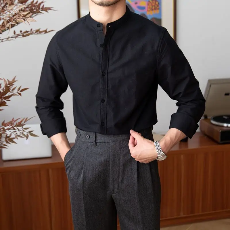 Hearujoy Men's Long Sleeved Wrinkle Resistant Shirt Spring Summer Suitable Formal Wear Stand Up Collar Casual Black White Elastic Blouse