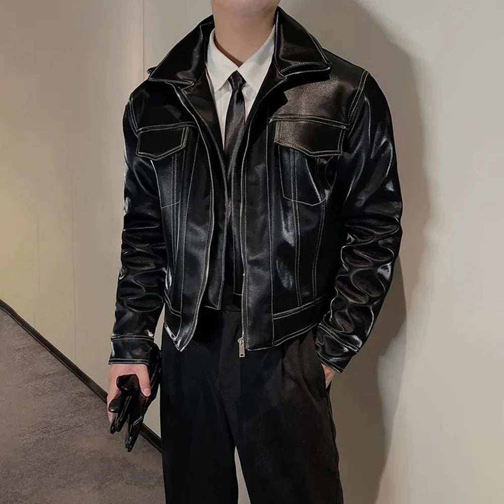 Hearujoy Mens Motorcyclist Topstitch Warm Fake Two-Piece Pu Leather Jacket Genderless Fashion Trend Short Leather Jacket Unisex