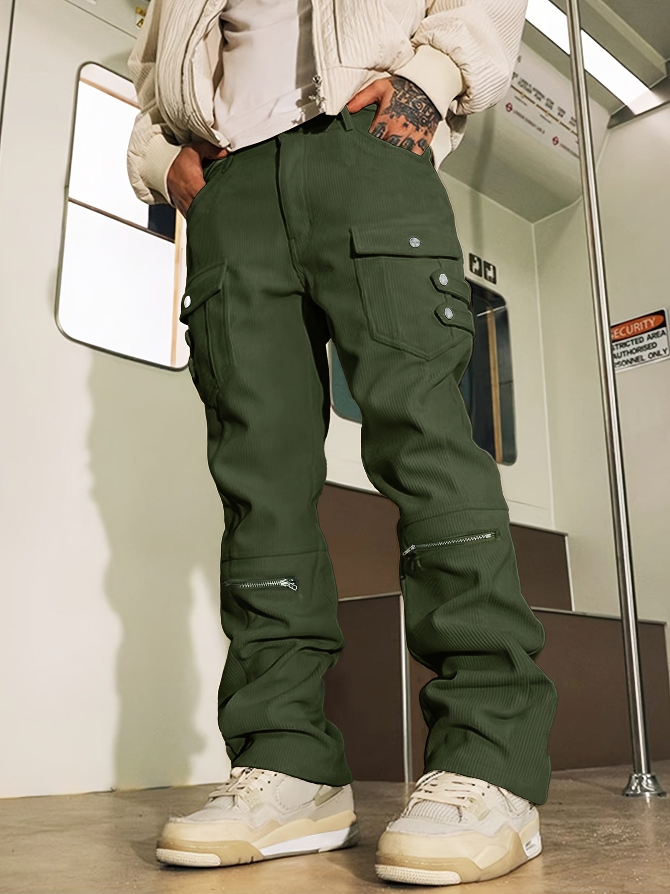 Hearujoy Men's Olive Green Corduroy Cargo Pants with Elastic Waist, Multiple Pockets & Zipper Details – Stylish Straight Leg Trousers for Casual Attire, Casual Streetwear|Street Style Pants|Durable Fabric