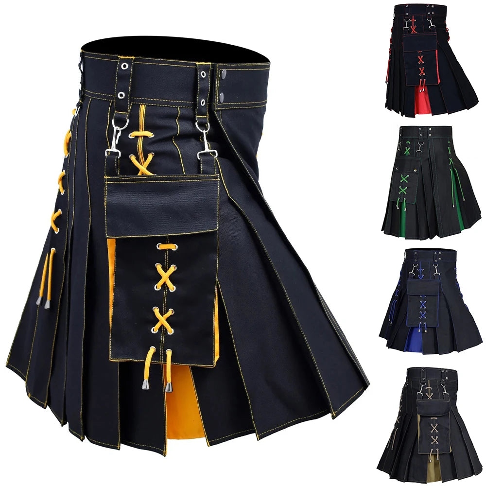 Hearujoy Mens Pocket Tie Rope Scottish Skirt 2024 New Genderless Casual Fashion Medieval Retro Steampunk Contrast Color Skirt Unisex