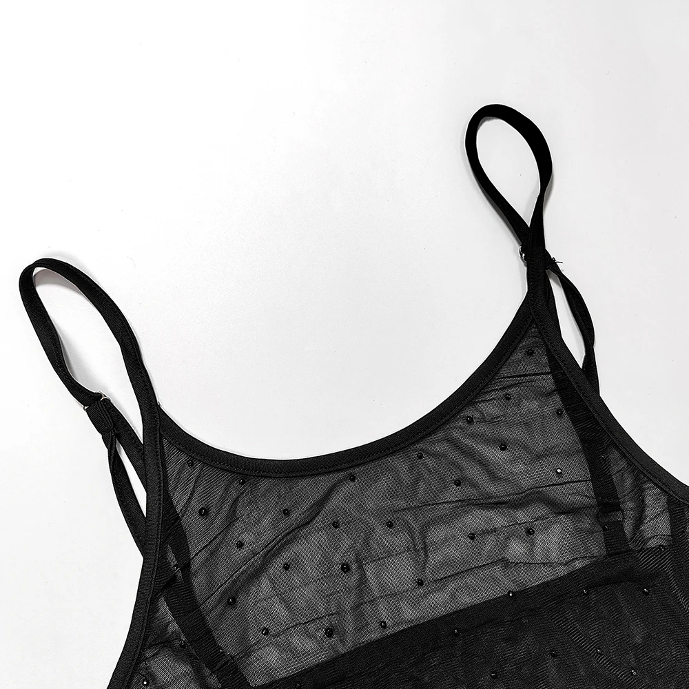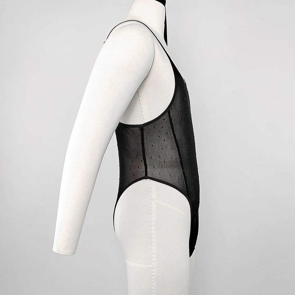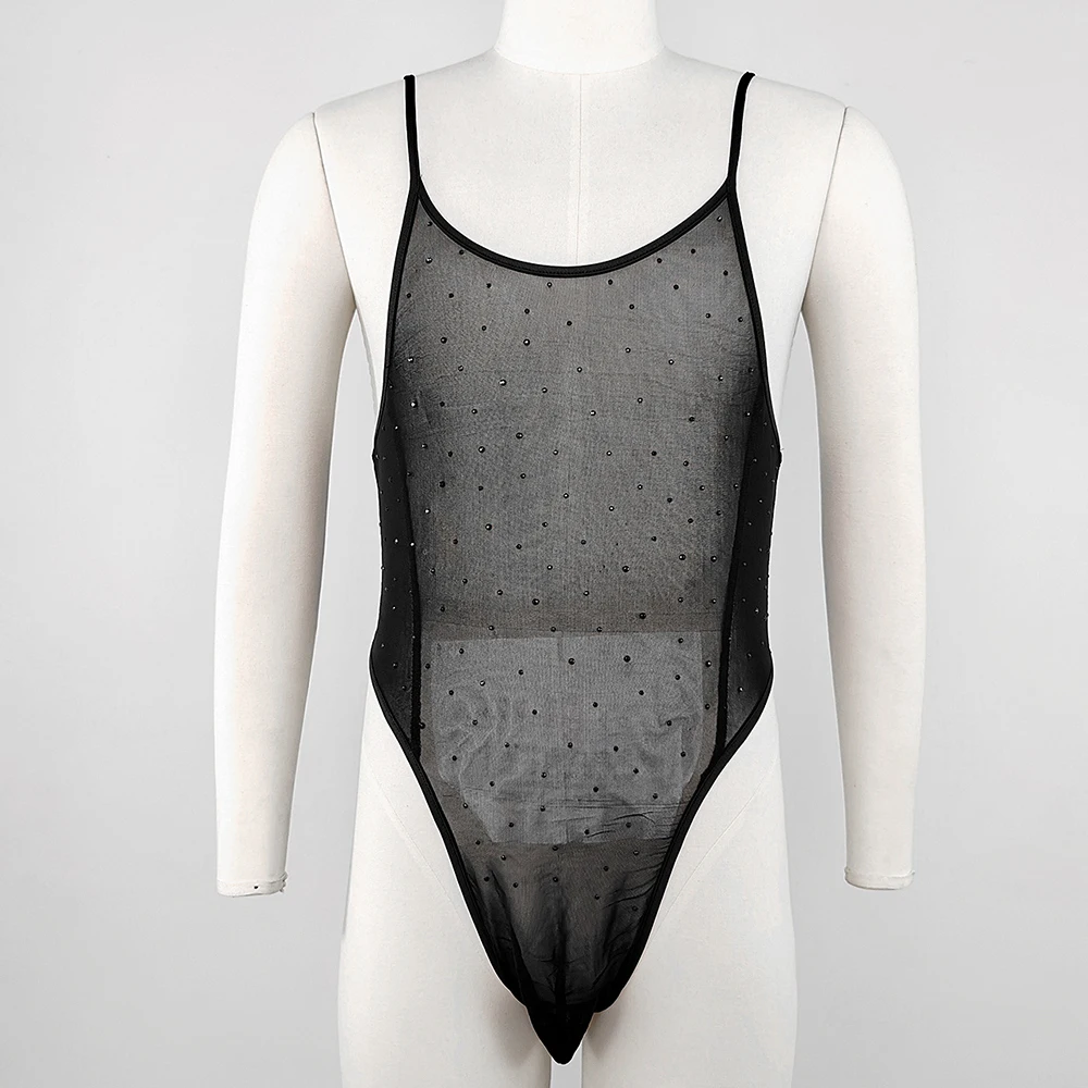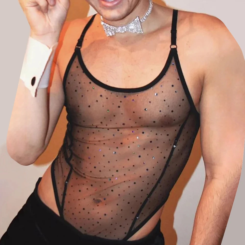 Hearujoy Mens see-through diamond suspender T-shaped mesh jumpsuit nightclub sexy youthful trendy thin breathable tight jumpsuit for men