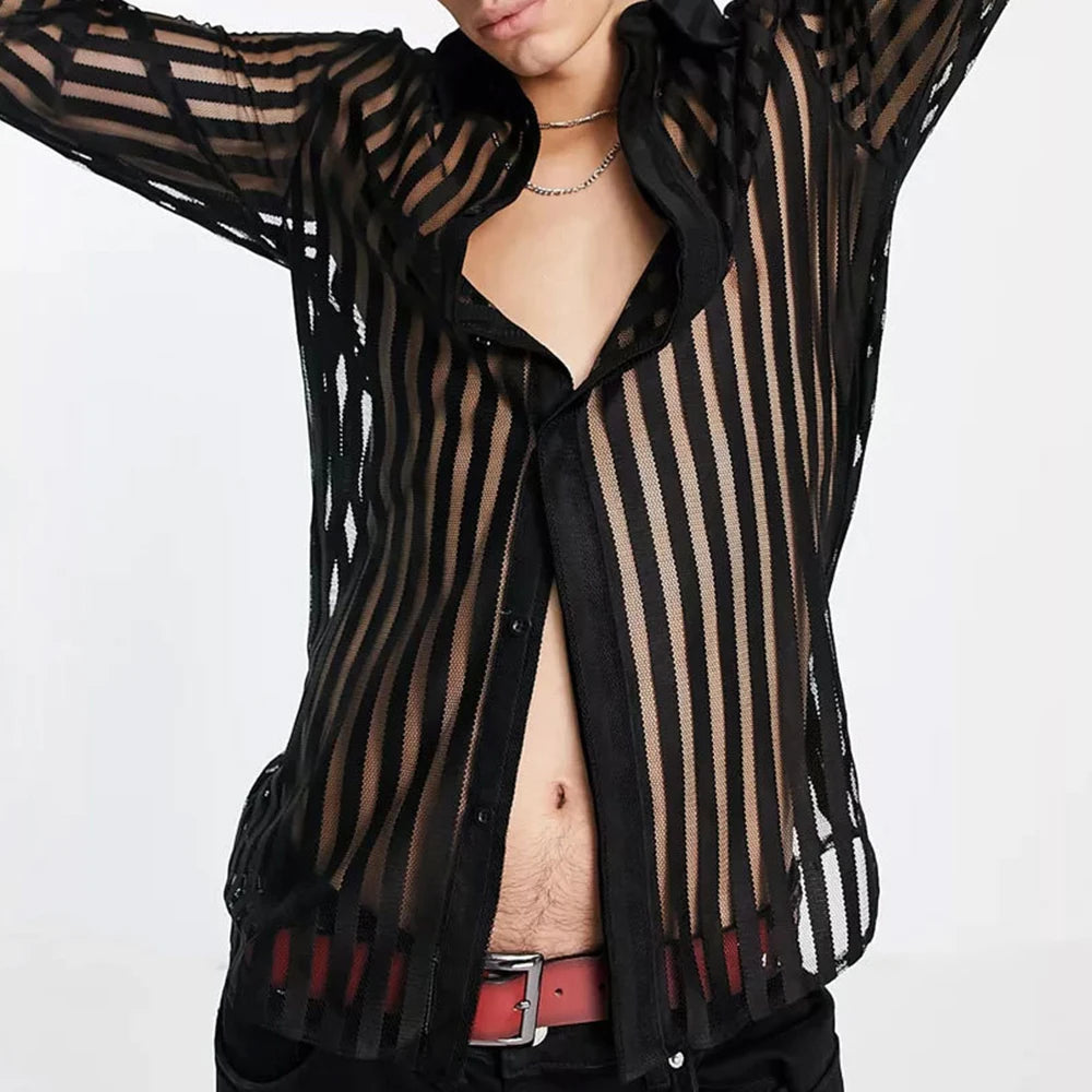 Hearujoy Mens See-Through Sexy Shirt Genderless Nightclub Print Loose Casual Striped Mesh Fashion Trendy Long-Sleeved Shirt Unisex