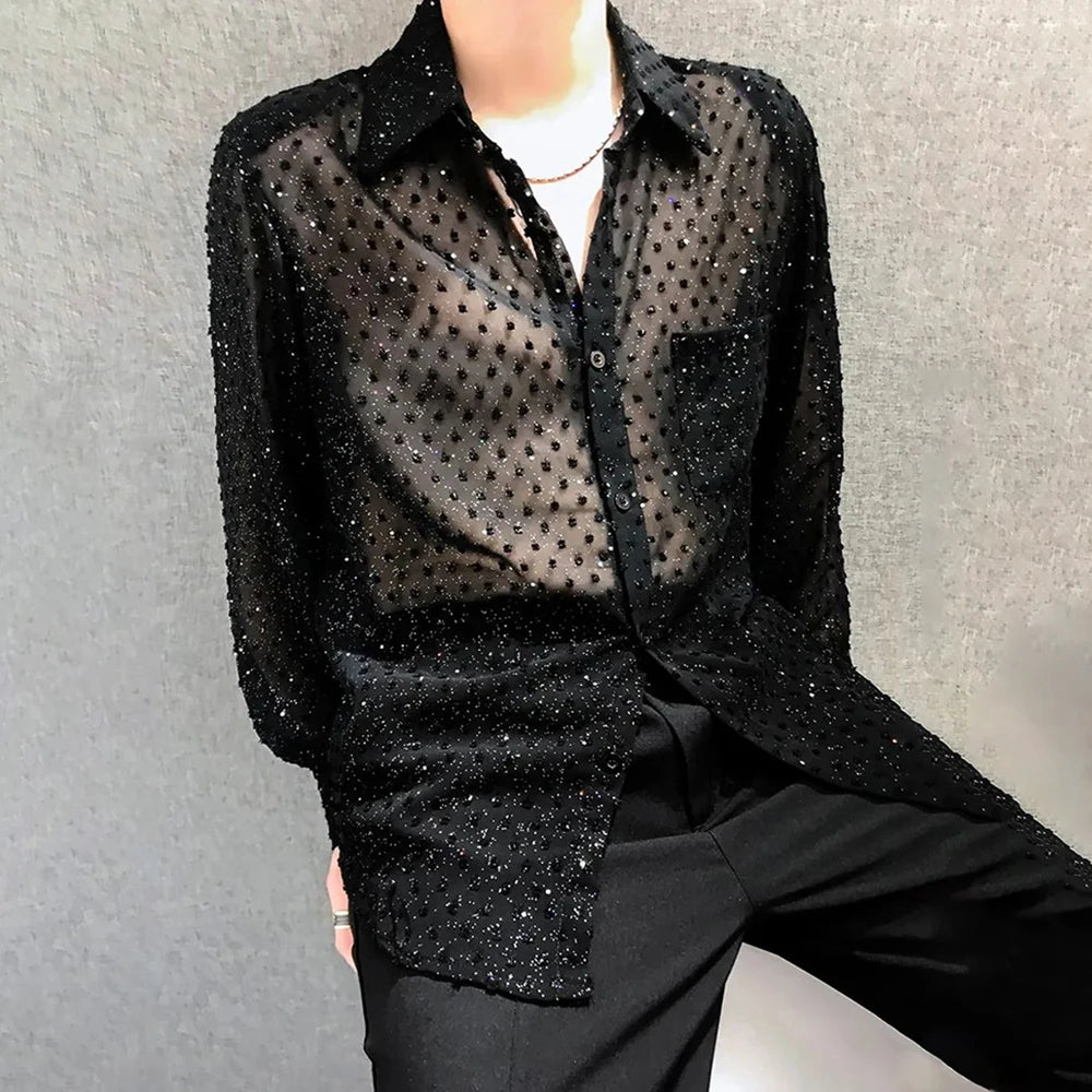 Hearujoy Mens Sexy Mesh See-Through Long-Sleeved Shirt Autumn Genderless Fashion Youth Nightclub Shiny Breathable Performance Top Unisex