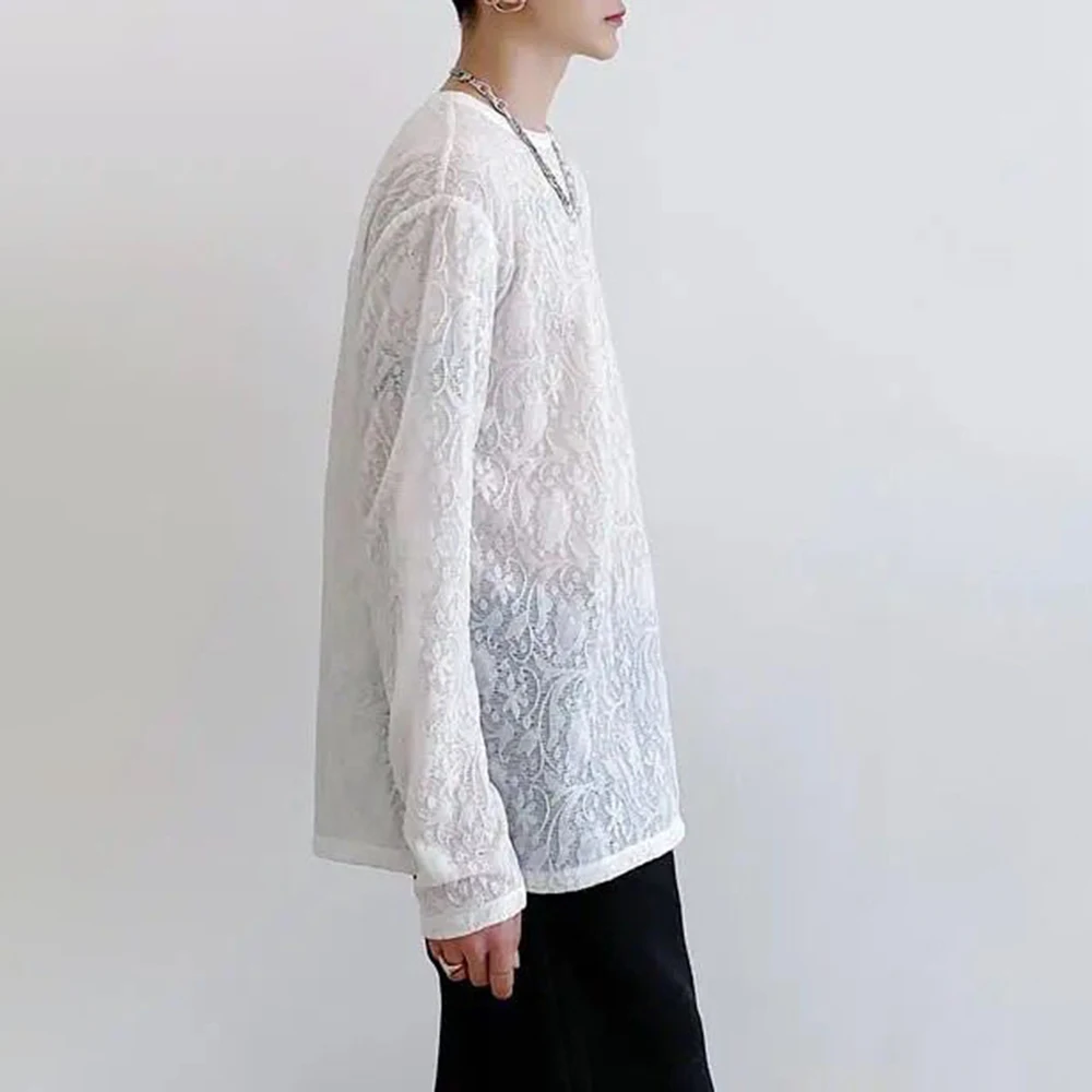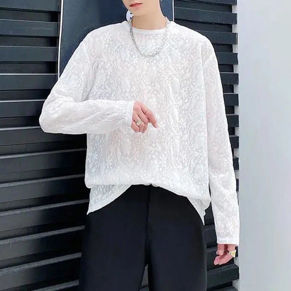 Hearujoy Mens Sexy See-Through Lace Floral Long-Sleeved Top 2024 New Genderless Fashion Temperament French Retro Inner T-Shirt Unisex
