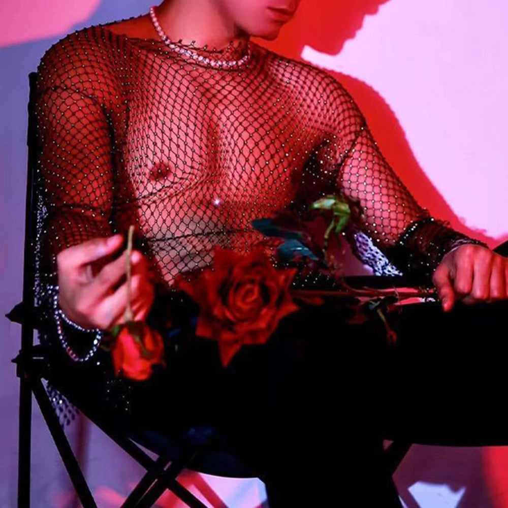 Hearujoy Mens Sexy Sparkling Diamond Hollow Long-Sleeve Vest Genderless Trendy Nightclub See-Through Diamond Slim-Fitting Top Unisex