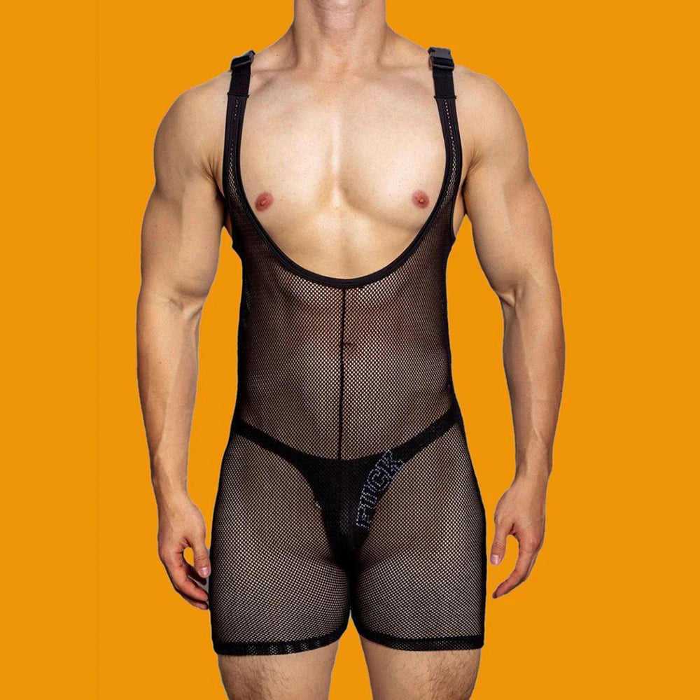 Hearujoy Mens sexy tight-fitting solid color mesh see-through jumpsuit shaping breathable sexy suspenders home underwear for men