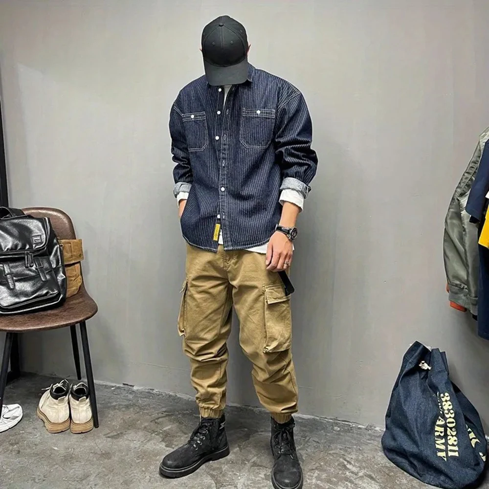 Hearujoy Mens Shirt Low Shoulder Striped Denim Long Sleeved Shirt Autumn Casual American Hawaiian Vintage Baggy Top Men's Clothing