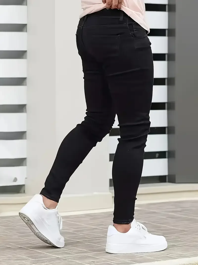 HEARUJOY - Men's Slim-Fit Ripped Jeans - Stylish Black Distressed Denim with Raw Hem, Comfortable & Versatile for All Seasons, Casual Stree
