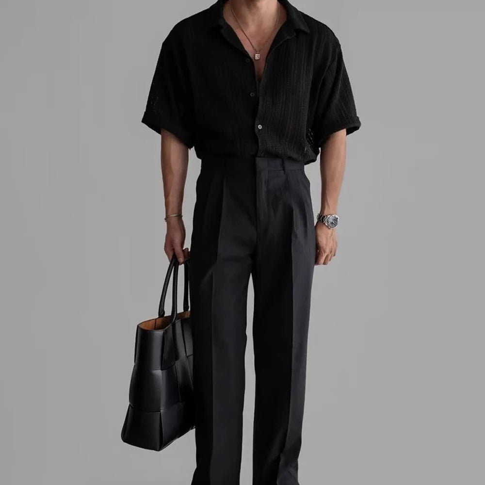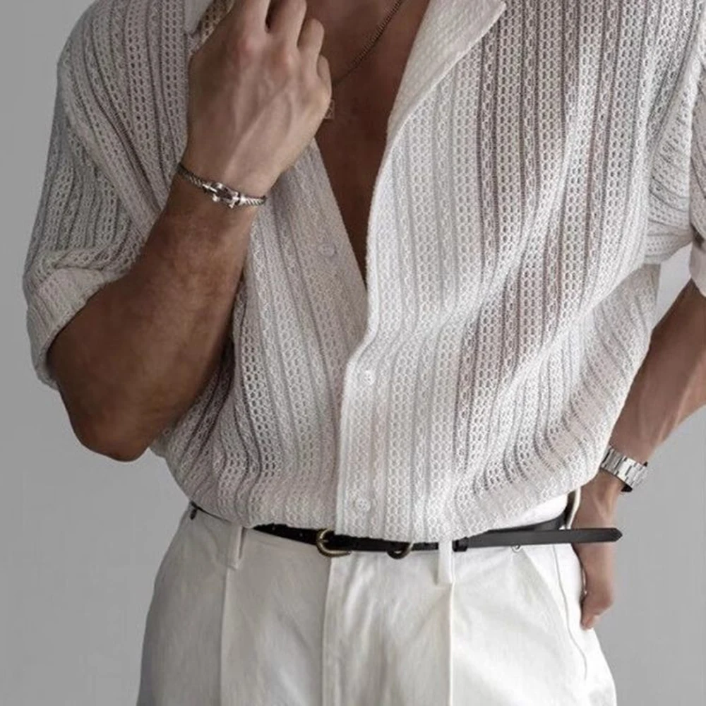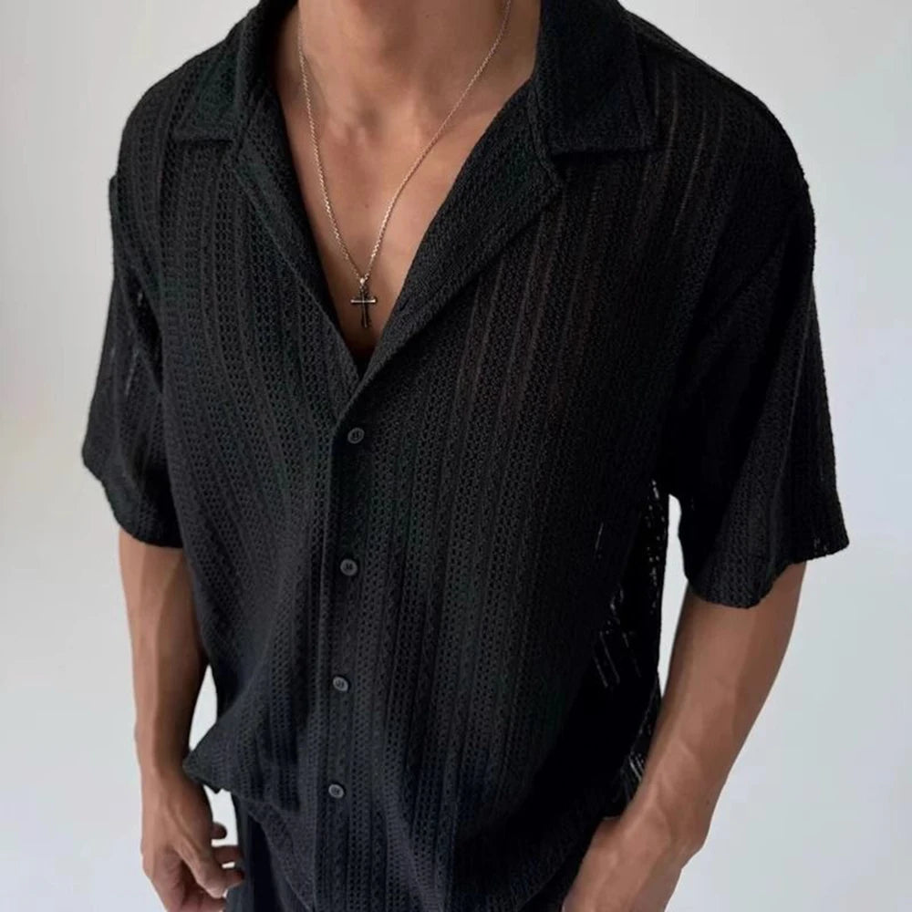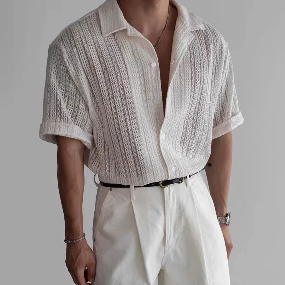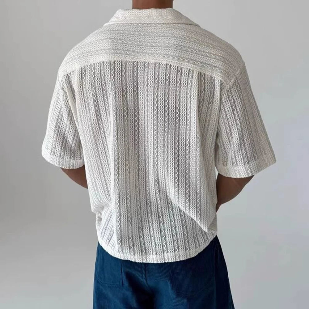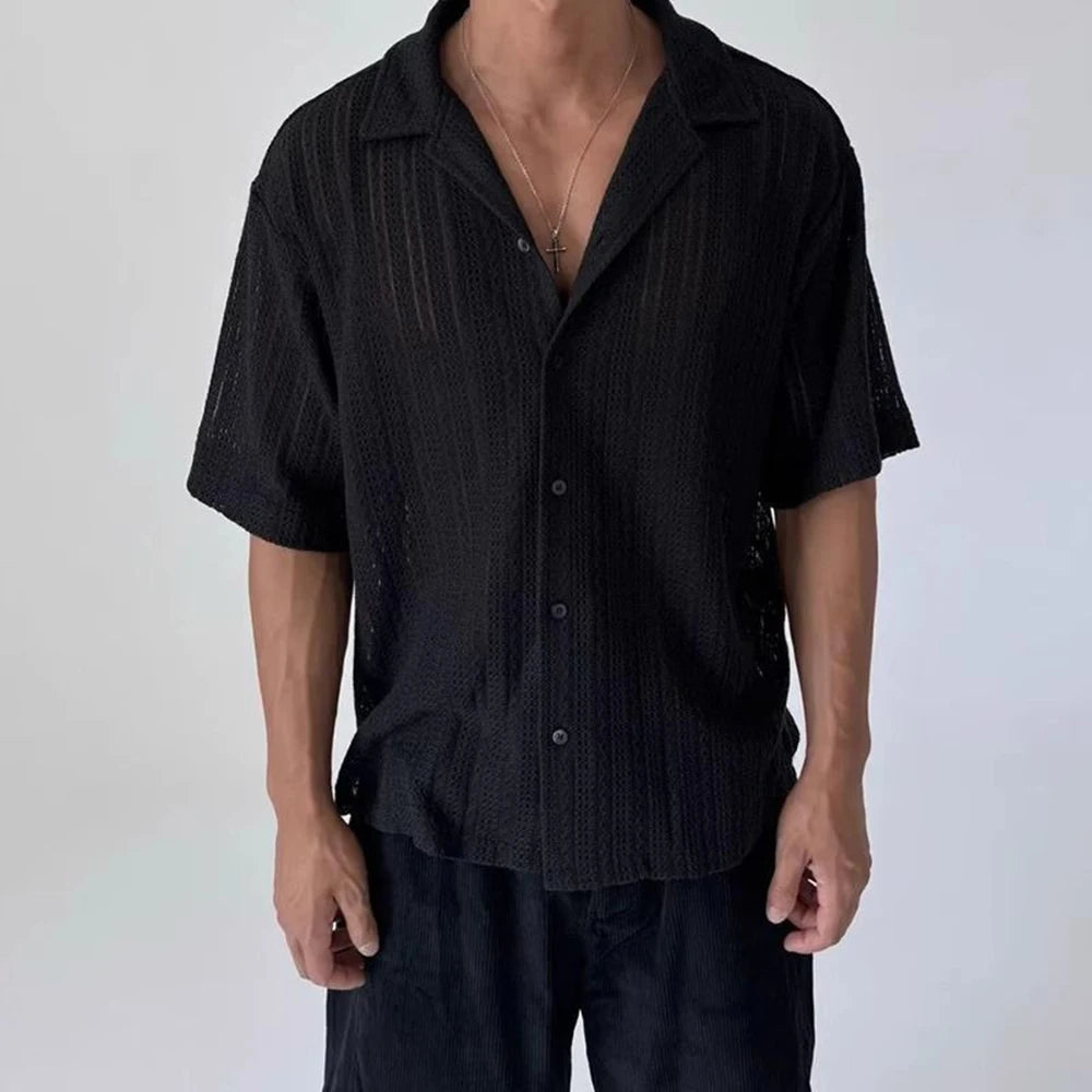 HEARUJOY - Men's Solid Color Hollow Short-Sleeved Shirt American Retro Fashion Trend Simple Casual Loose Breathable Summer New Men's Tops