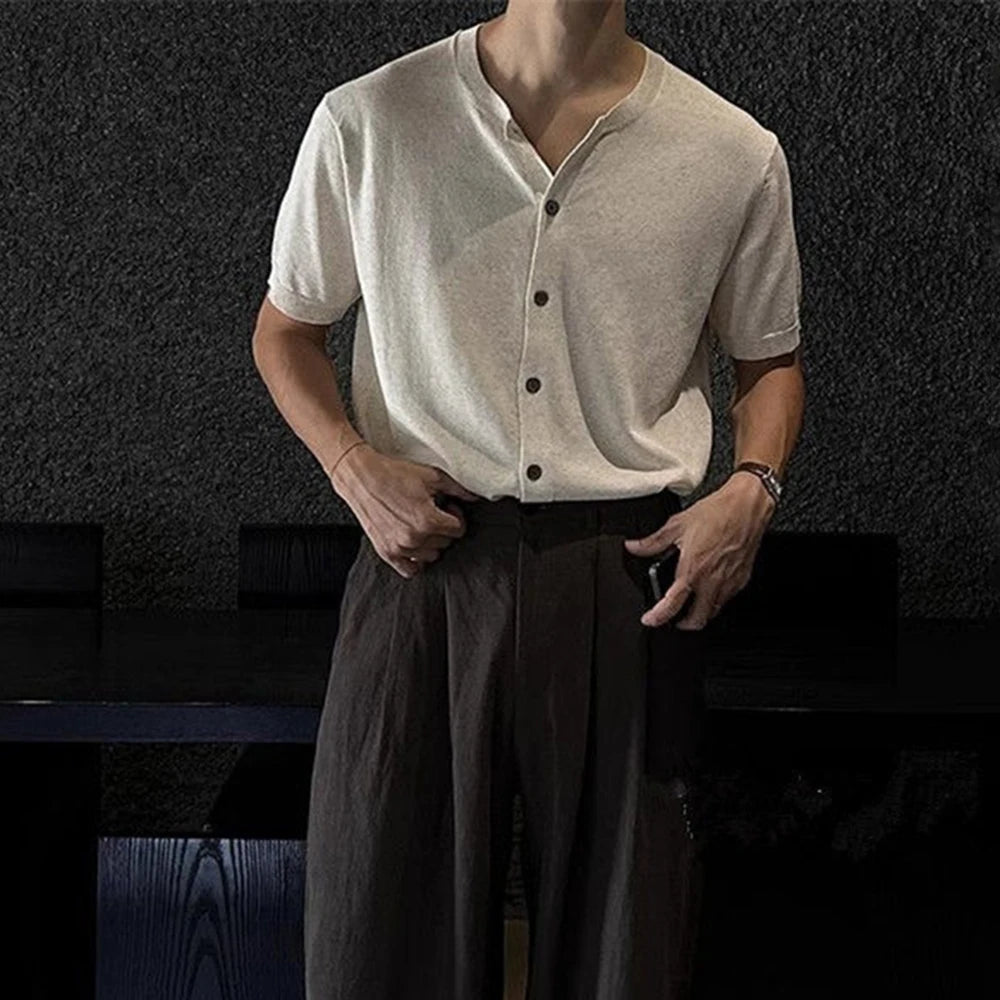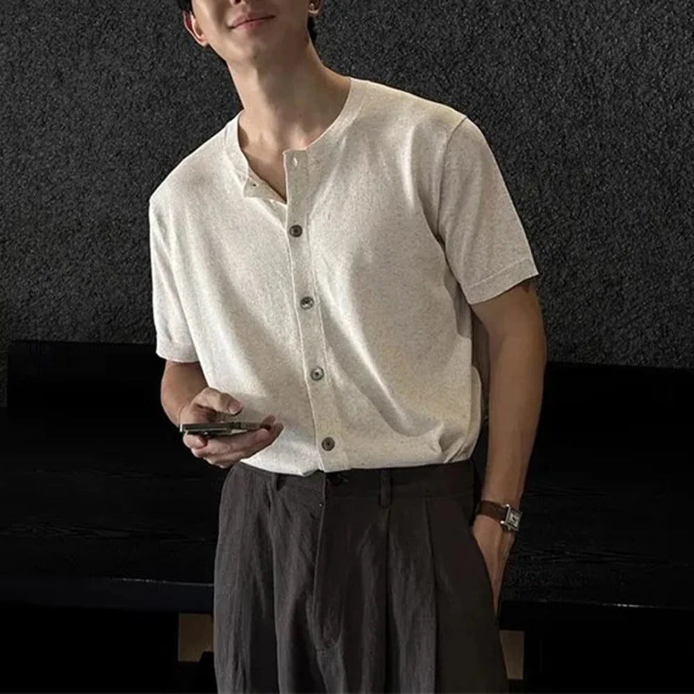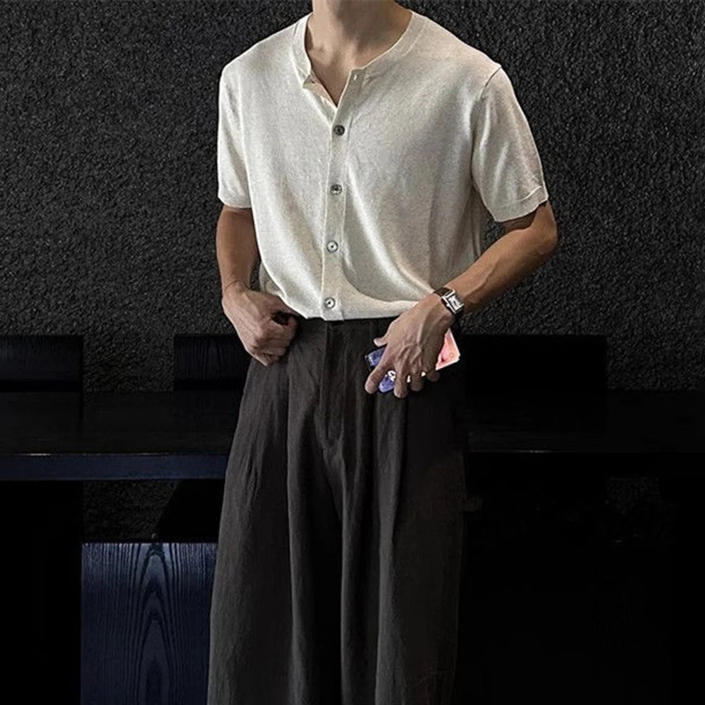 HEARUJOY - Men's Solid Color Knitted Cardigan Short-Sleeved Shirt American Retro Fashion Trend Street Loose Breathable Niche Men's Tops