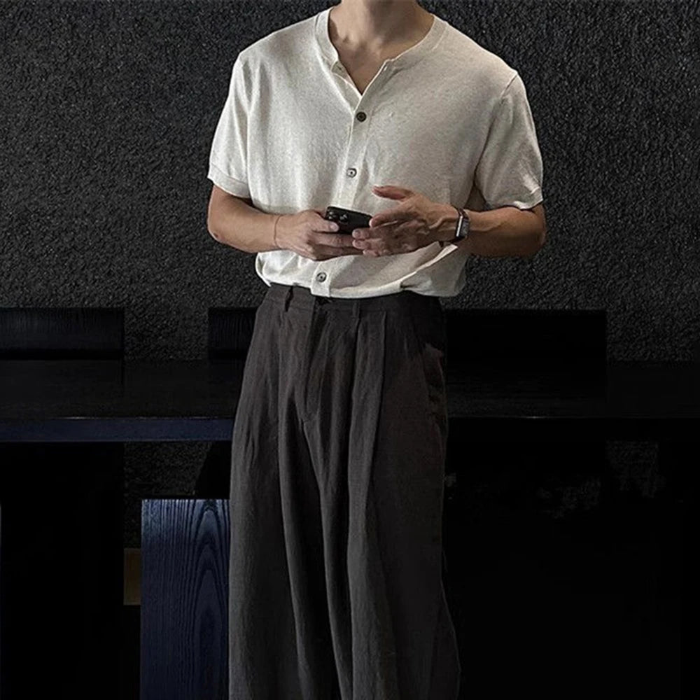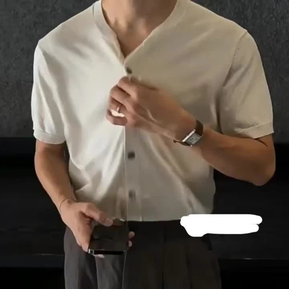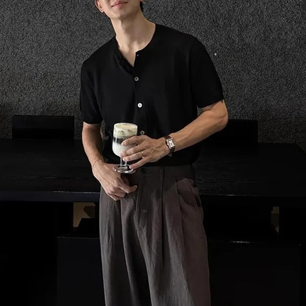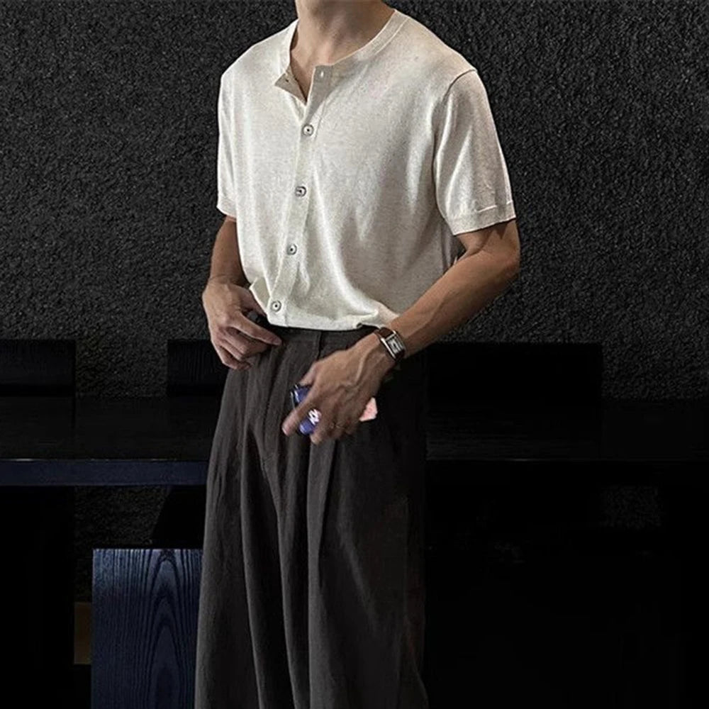 HEARUJOY - Men's Solid Color Knitted Cardigan Short-Sleeved Shirt American Retro Fashion Trend Street Loose Breathable Niche Men's Tops