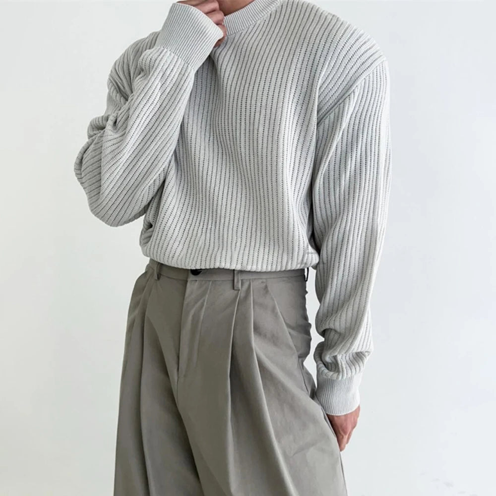 Hearujoy Mens Solid Color Threaded Round Neck Knitted Sweater Genderless Autumn Winter Fashion Casual Loose Simple Sweater Unisex