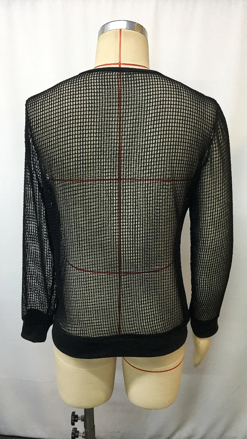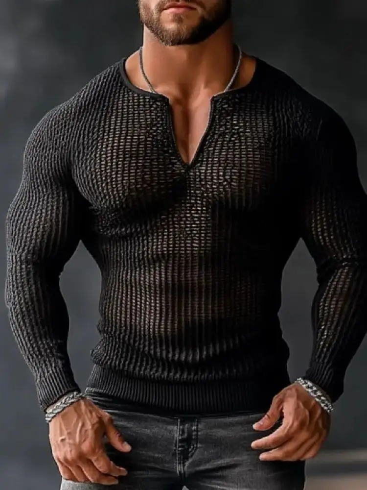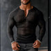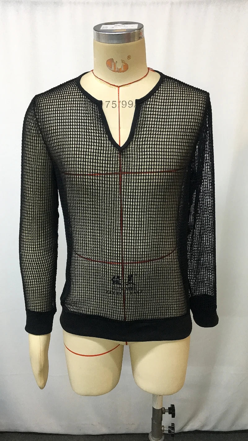 HEARUJOY - Men's Transparent Mesh Shirt V-Neck Long Sleeve Casual Loose Fit Breathable Summer Top Trendy Streetwear Fashion