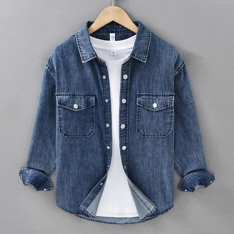 HEARUJOY - Men's Vintage Washed Denim Shirt Jacket 100% Cotton Chest Pocket Distressed Workwear Long Sleeve Casual Shirt for Spring Summer