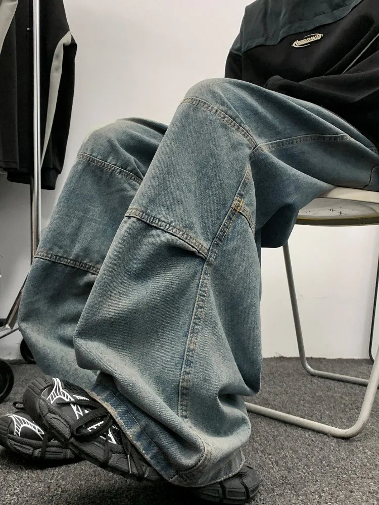 Hearujoy New American Washed Distressed Spliced Jeans Men's High Street Retro Loose Straight Casual Floor-length Trousers Male