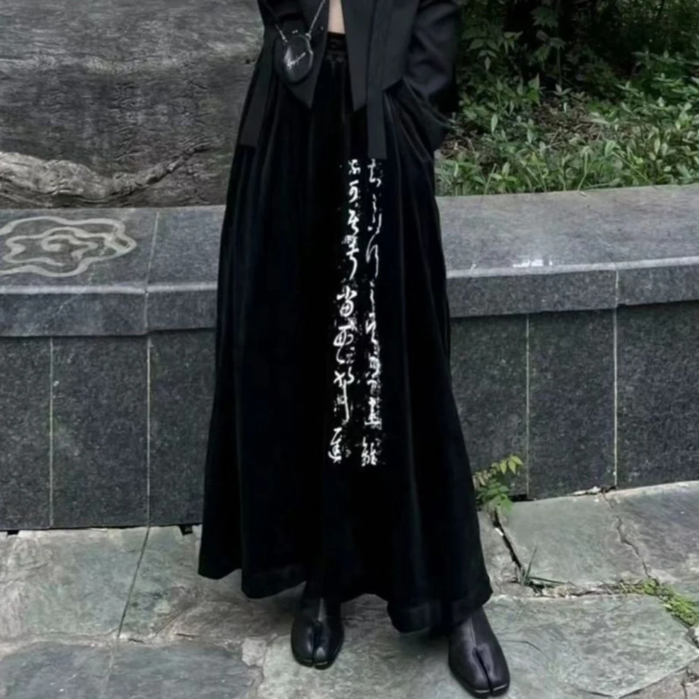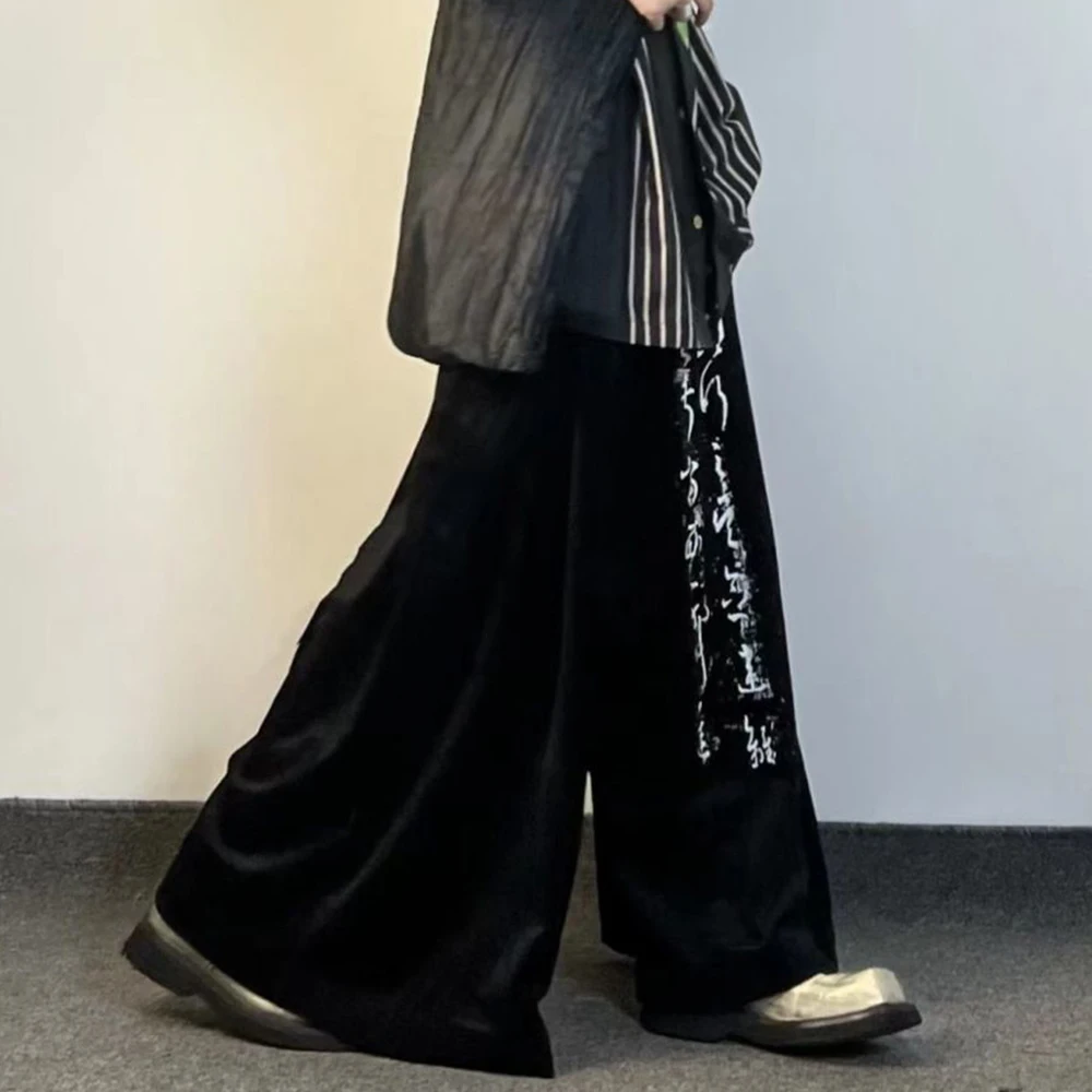 Hearujoy New Chinese Calligraphy Printed Corduroy Wide Leg Pants Men Trendy Brand Drape Straight Pants Man Original Retro Casual Trousers