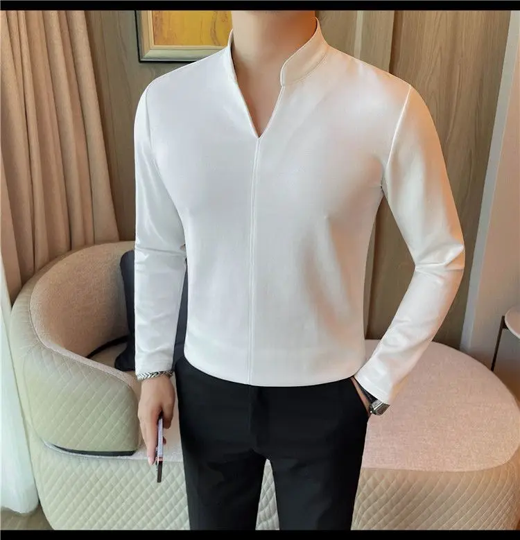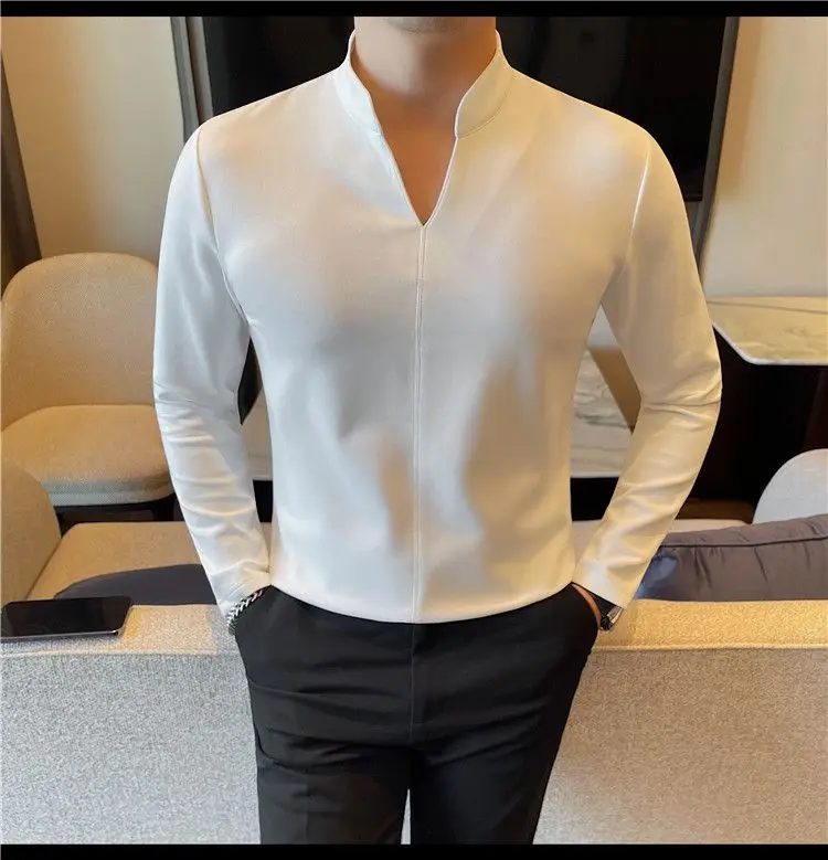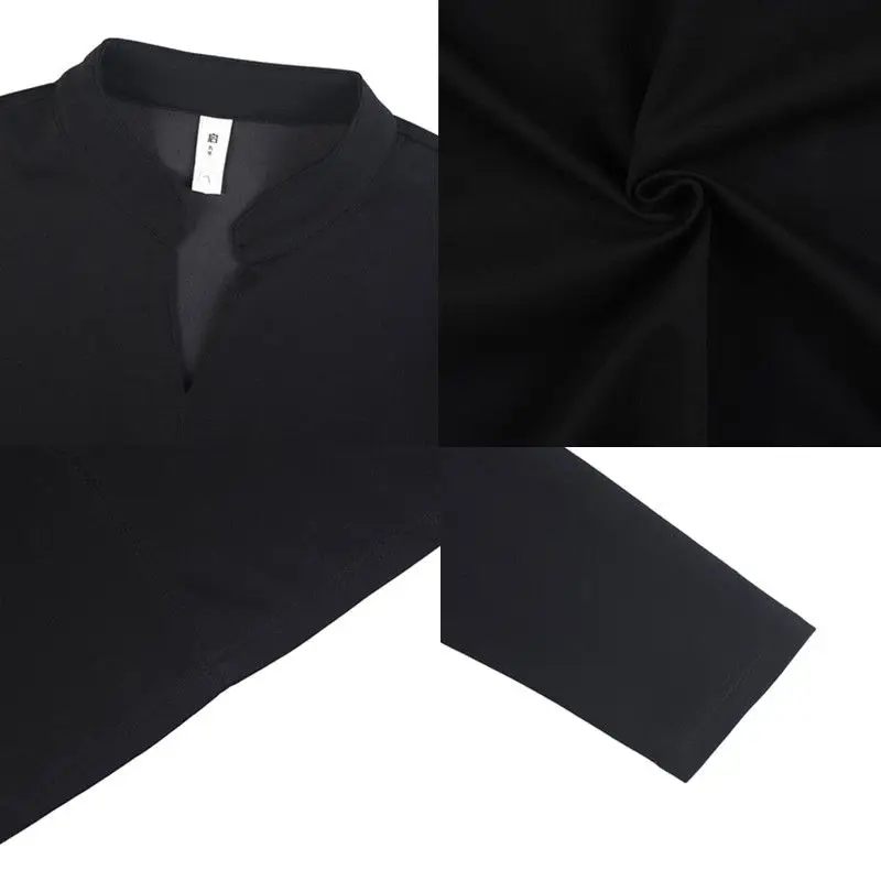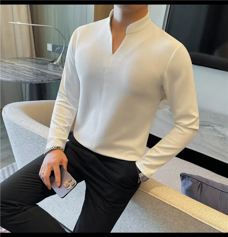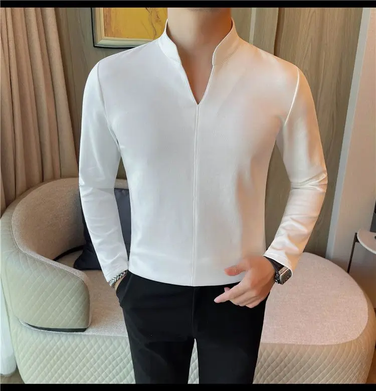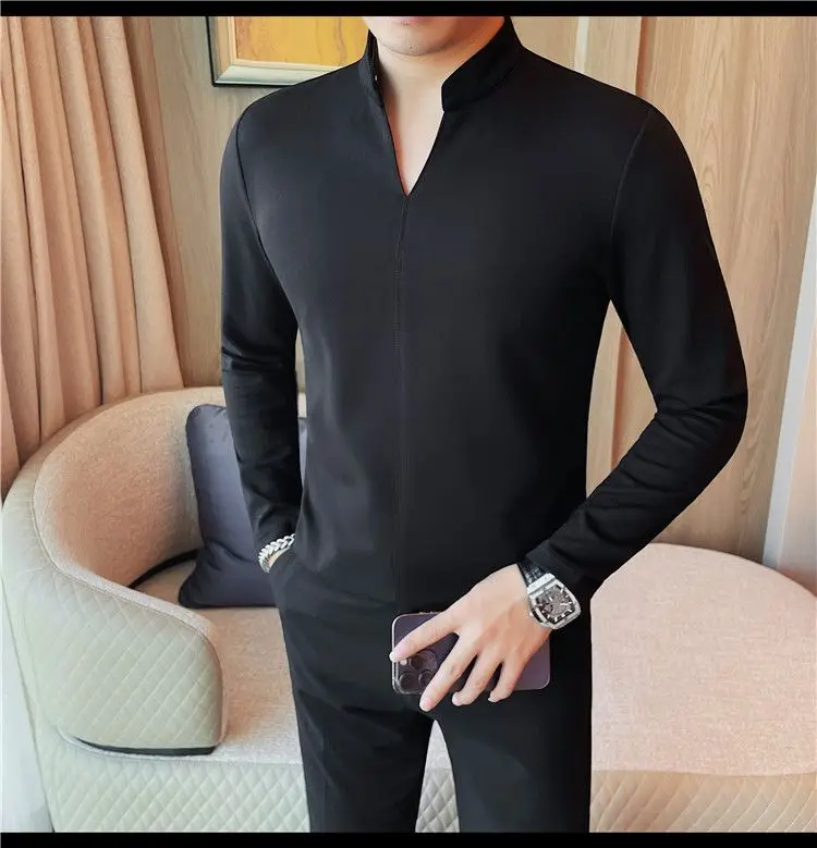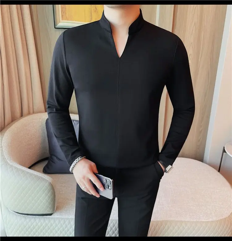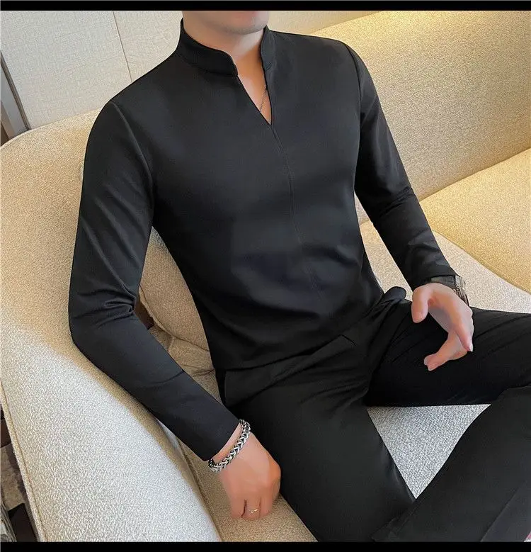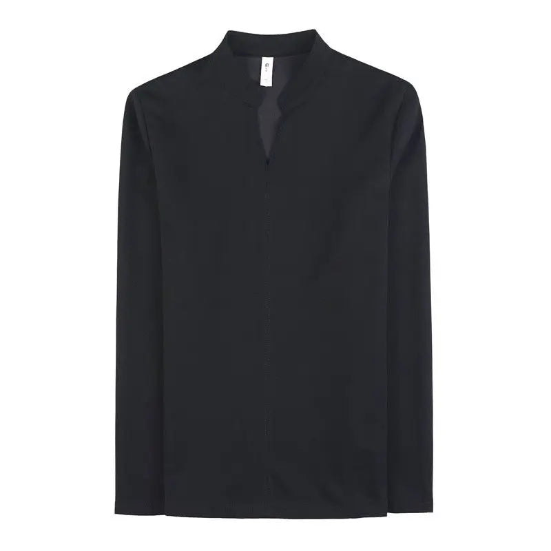 HEARUJOY - New Chinese Solid Color Slim and Simple Men's T-shirt Stand Collar Elastic Casual V-neck T Base Shirt