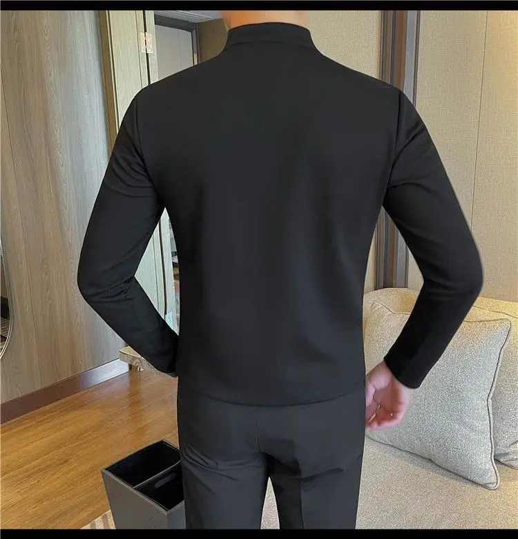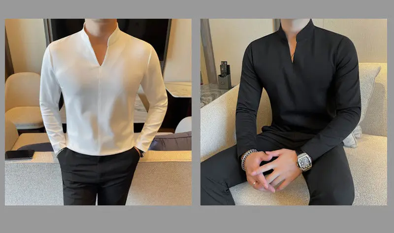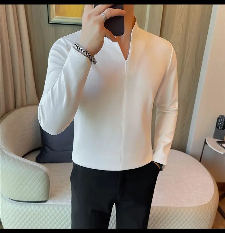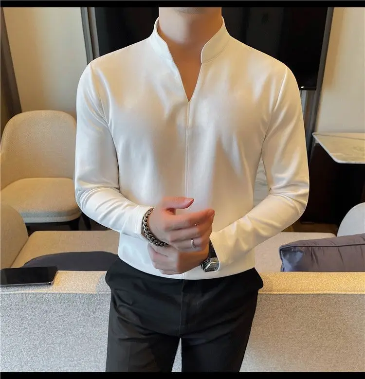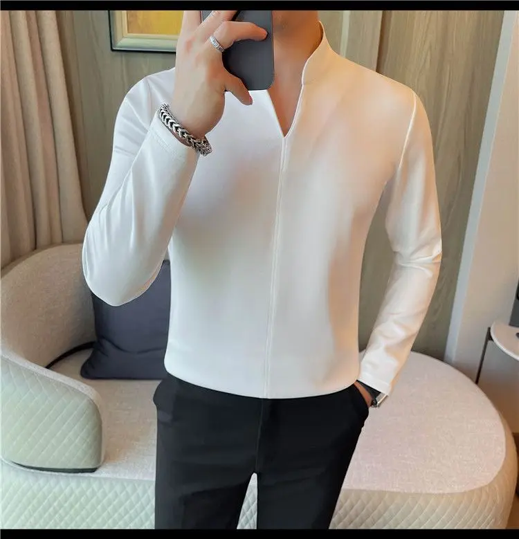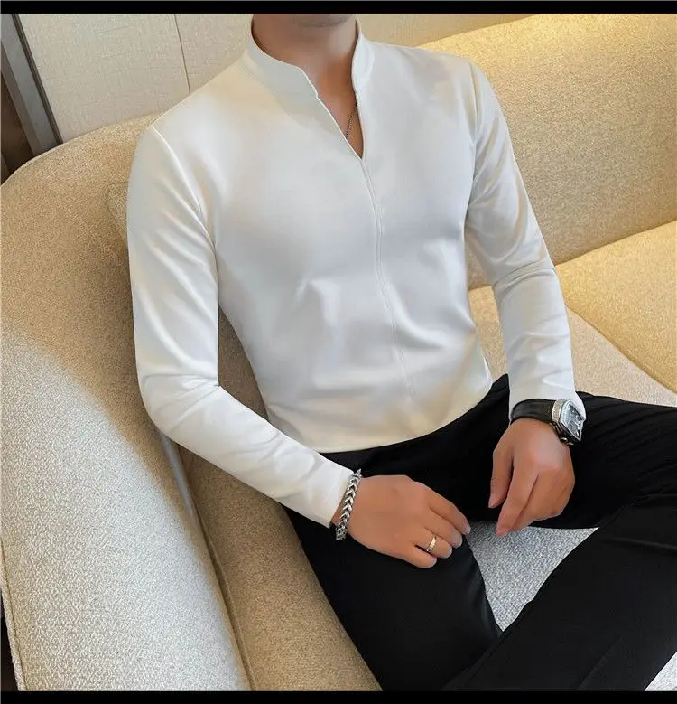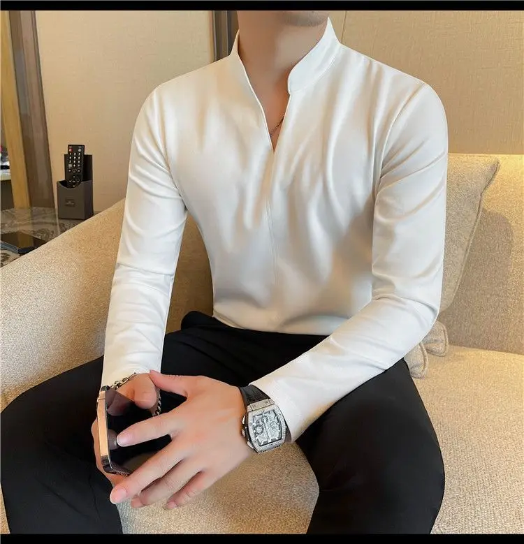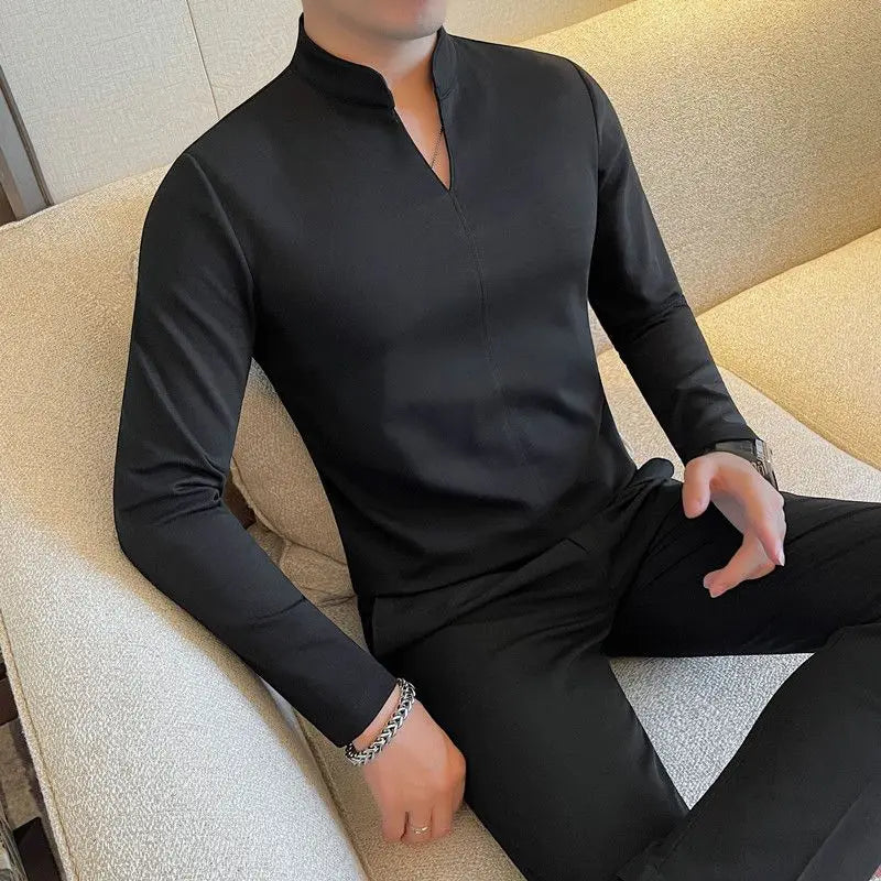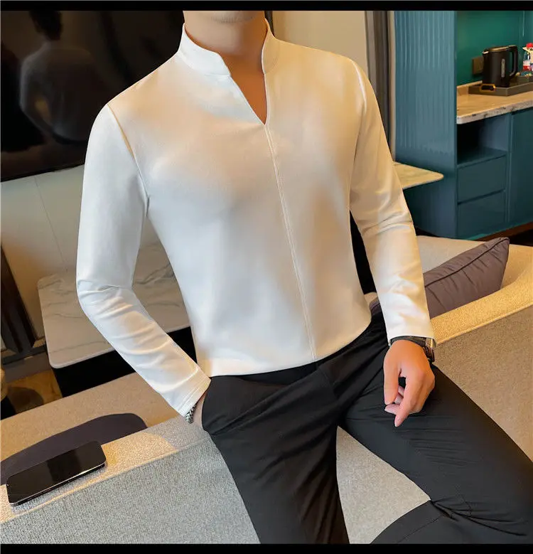 HEARUJOY - New Chinese Solid Color Slim and Simple Men's T-shirt Stand Collar Elastic Casual V-neck T Base Shirt