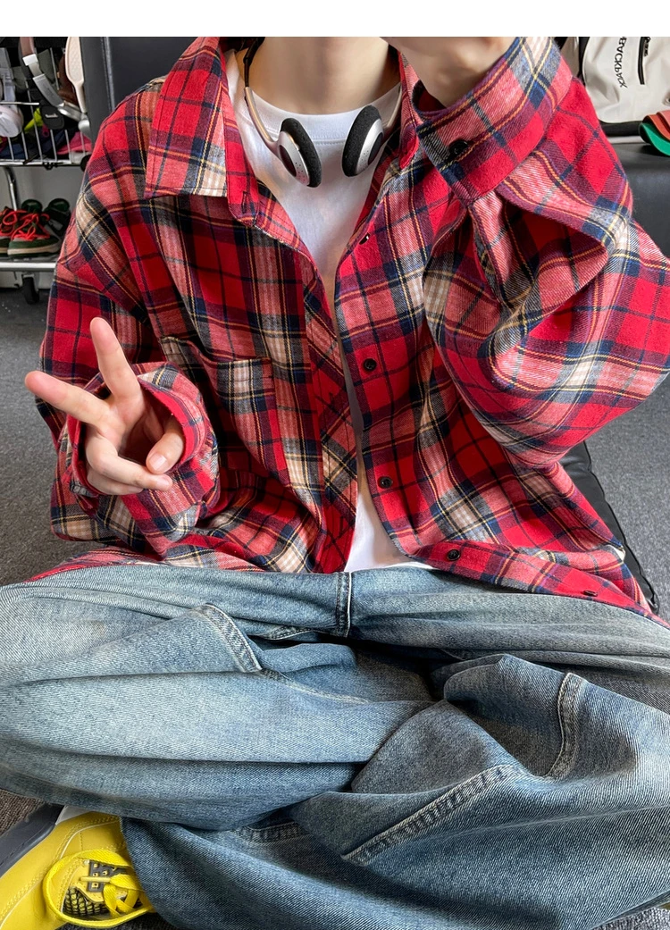 HEARUJOY - New in Spring Men's Shirts Classic Harajuku Long Sleeved Plaid Shirt Red Checkered Shirt Chemise Homme Cotton Male Check Shirts