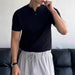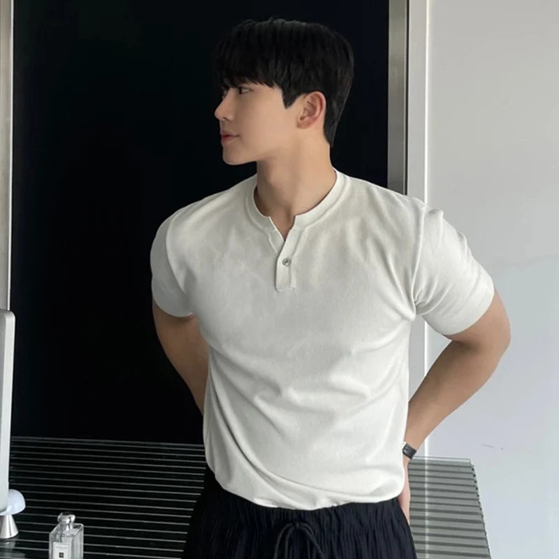 HEARUJOY - New Men Luxury Henry Collar T-Shirt Leisure Slim Button-down Solid Color Short Sleeve Tops Korean Style Summer Breathable Tees