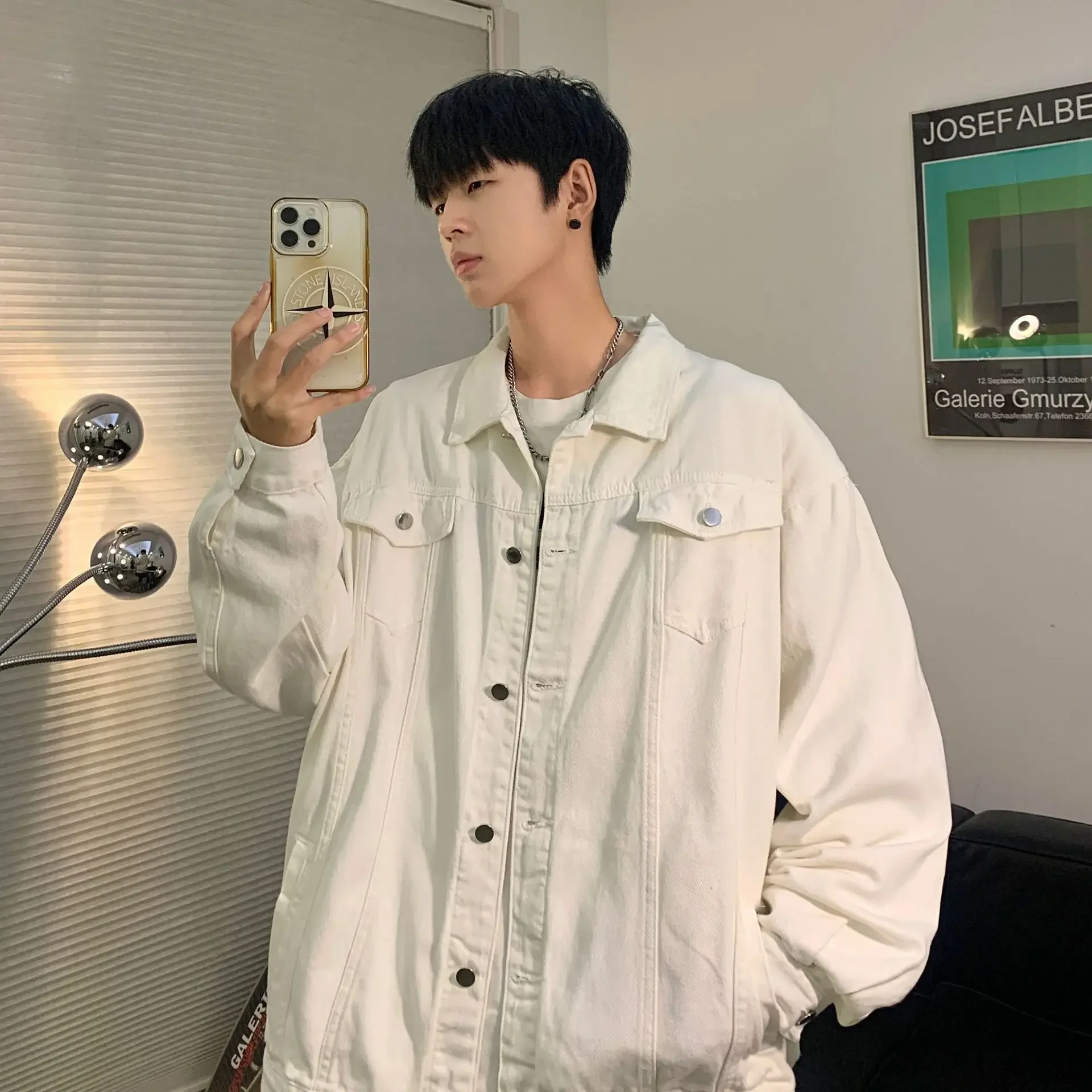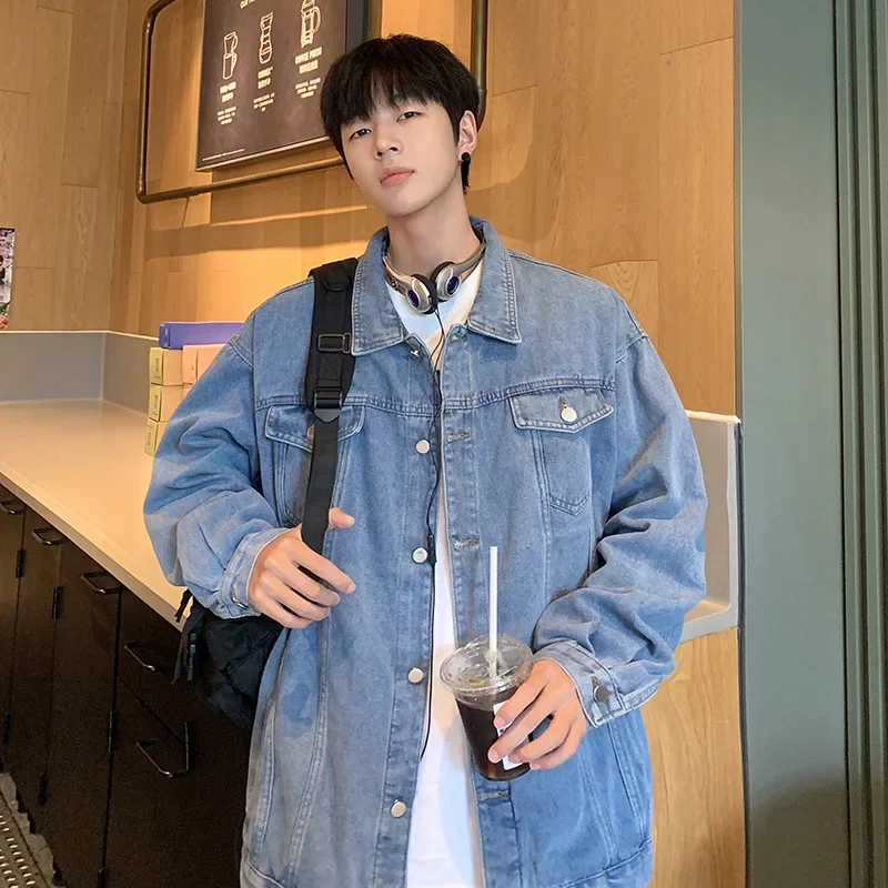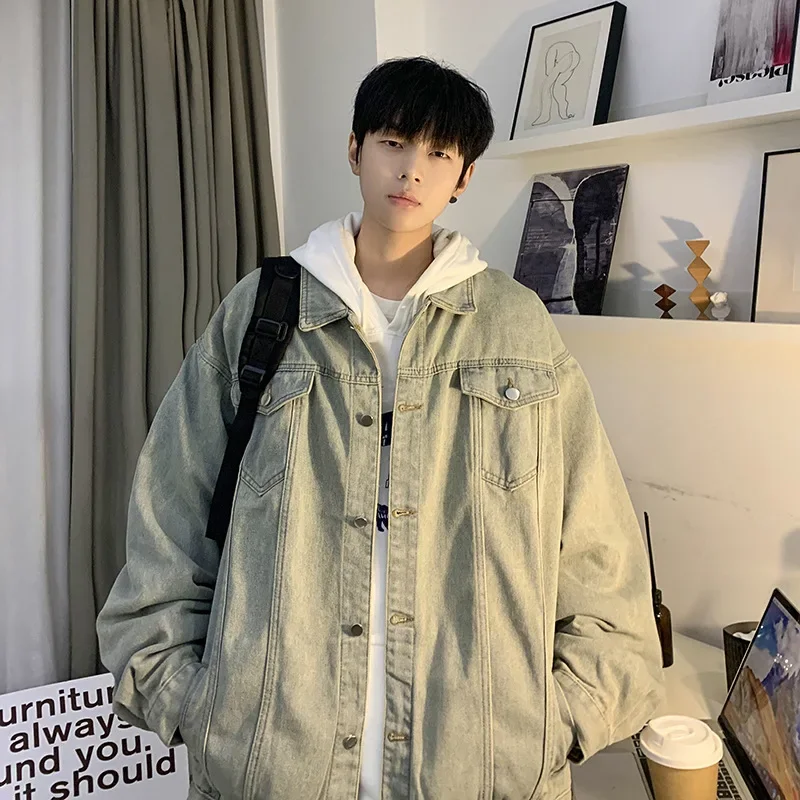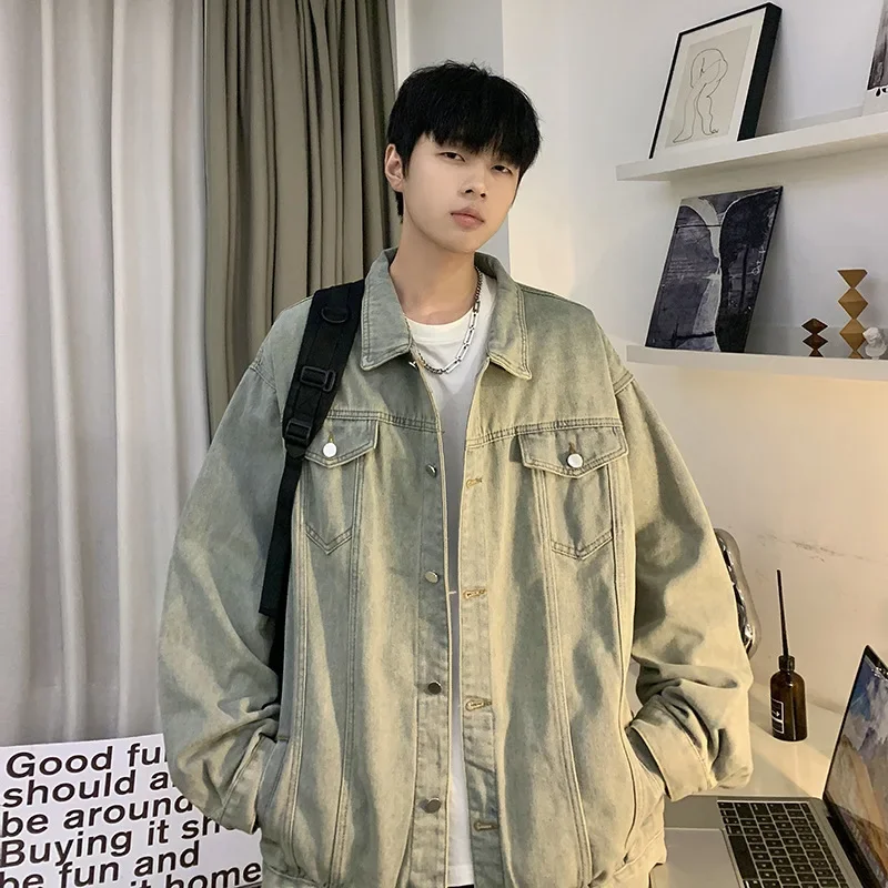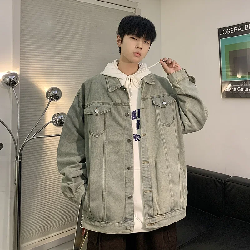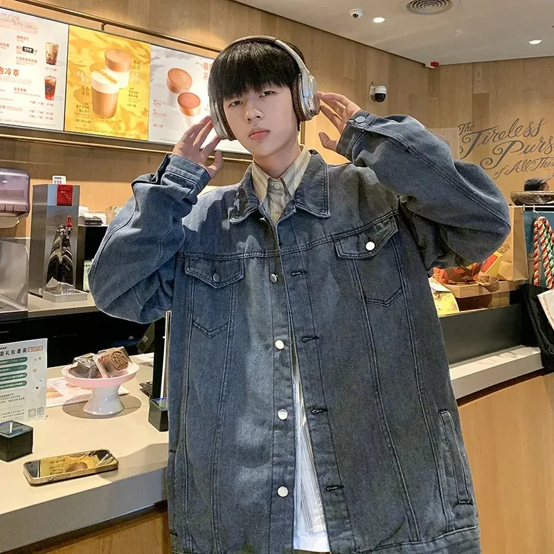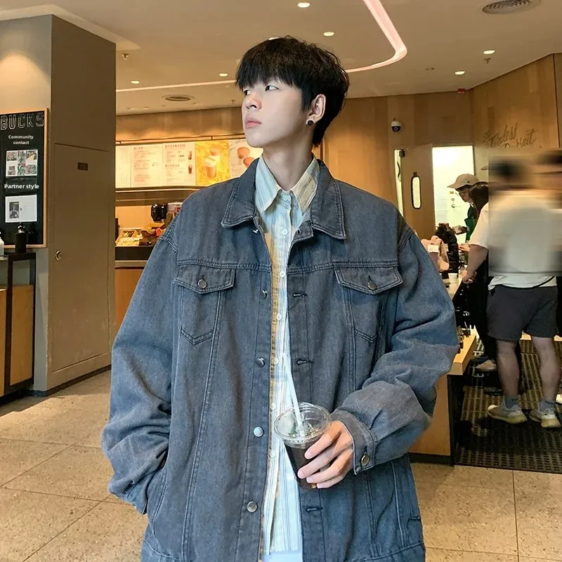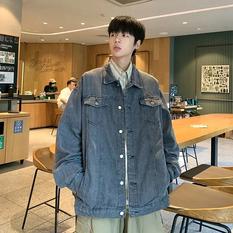 Hearujoy New Trendy Men's Denim Jacket Loose Fit Casual Lapel Jacket Vintage Washing Style Workwear For Autumn Winter