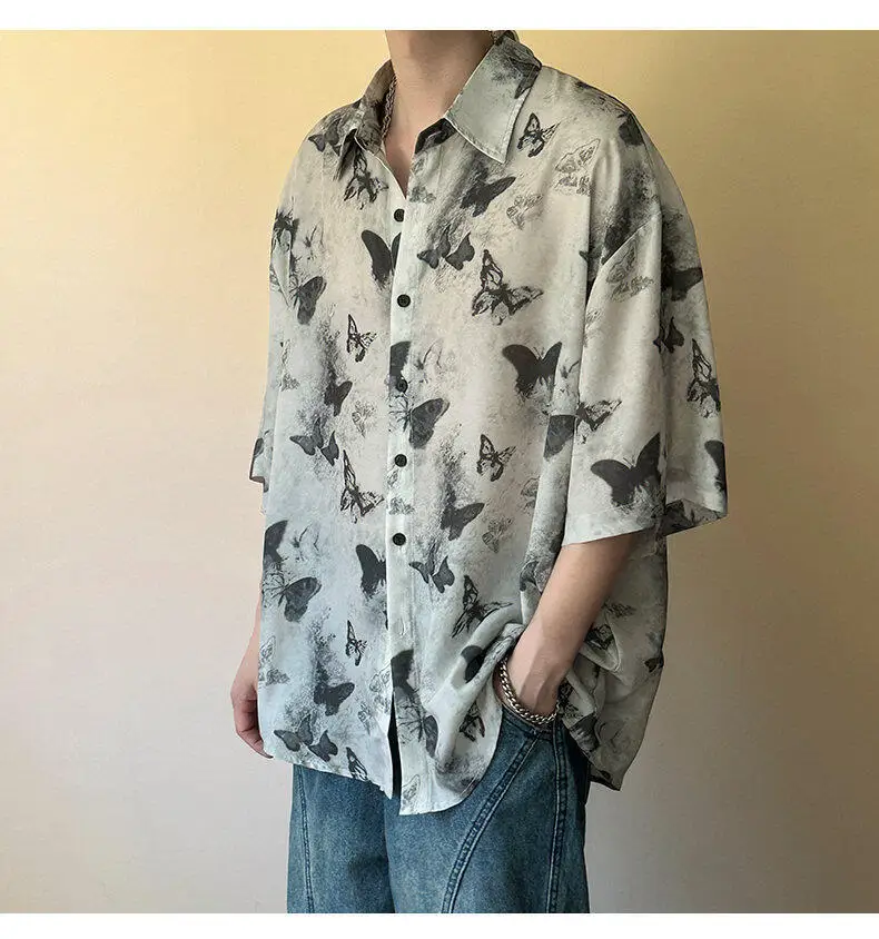 HEARUJOY - Nichre Design Men's Shirts Turn-down Collar Butterfly Printing Contrast Color Short Sleeved Single Breasted Stylish